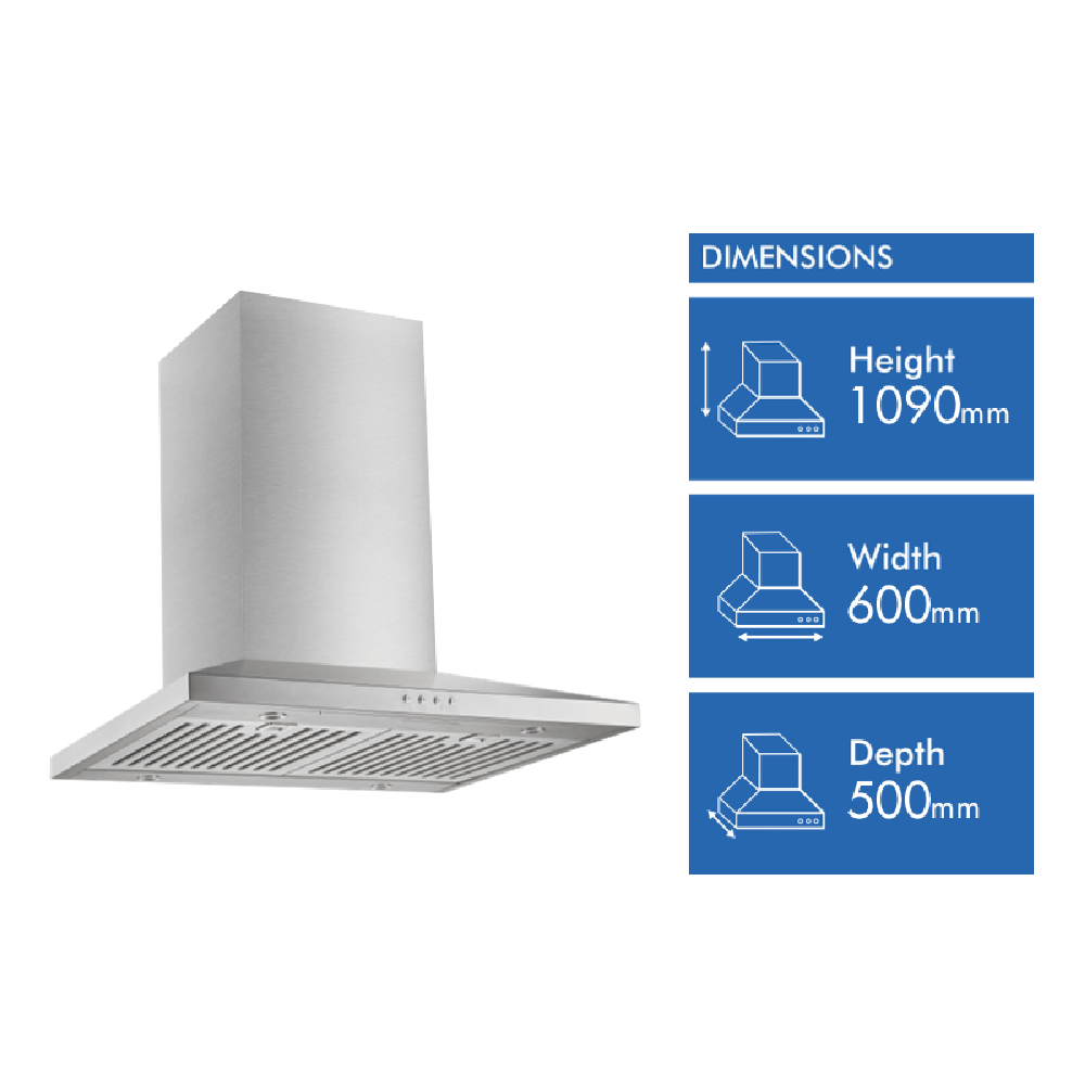 Transform your kitchen with the sleek and modern Emilia 60cm Slim Line Canopy Rangehood. This stylish stainless steel hood not only looks great but also offers powerful performance. With a maximum extraction capacity of 800m3/hr this rangehood will quickly clear cooking odors and smoke from the air. Four energy-efficient LED lights illuminate your cooktop brilliantly while electronic push button controls allow easy selection of the three fan speeds. Ducted or recirculated operation gives you flexibility for installation. At just 60dB operation is quiet enough for comfortable conversation. With a width of 600mm height of 1090mm and depth of 500mm the Emilia rangehood is designed to fit above 600mm cooktops and ranges. The stainless steel filters are durable and simple to clean. Enjoy the peace of mind of a 2 year manufacturer's warranty. The manufacturer's part number for this product is CK60SCF. Bring home the Emilia Canopy Rangehood for a stylish quiet and powerful addition to your kitchen.