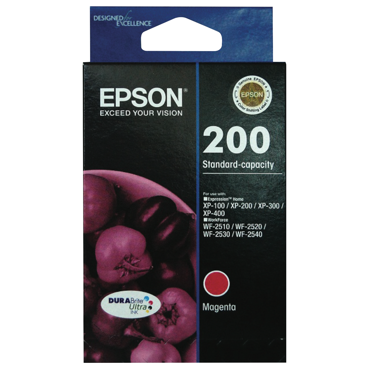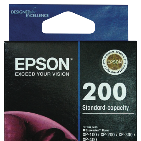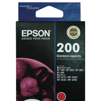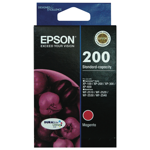Print vivid magenta pages with the Epson 200 DURABrite Magenta Ink Cartridge. This magenta ink cartridge produces sharp text and vivid graphics across up to 500 pages. Specially formulated DURABrite ink delivers laser-quality output that's water smudge and fade resistant. Designed for use with Epson XP-100 XP-200 XP-300 XP-310 XP-400 XP-410 Workforce WF-2510 WF-2520 WF-2530 and WF-2540 printers this cartridge enables you to print projects photos and documents with rich vibrant magenta tones. The manufacturer's part number for this product is T200392. For superior magenta printing choose the Epson 200 DURABrite Magenta Ink Cartridge.