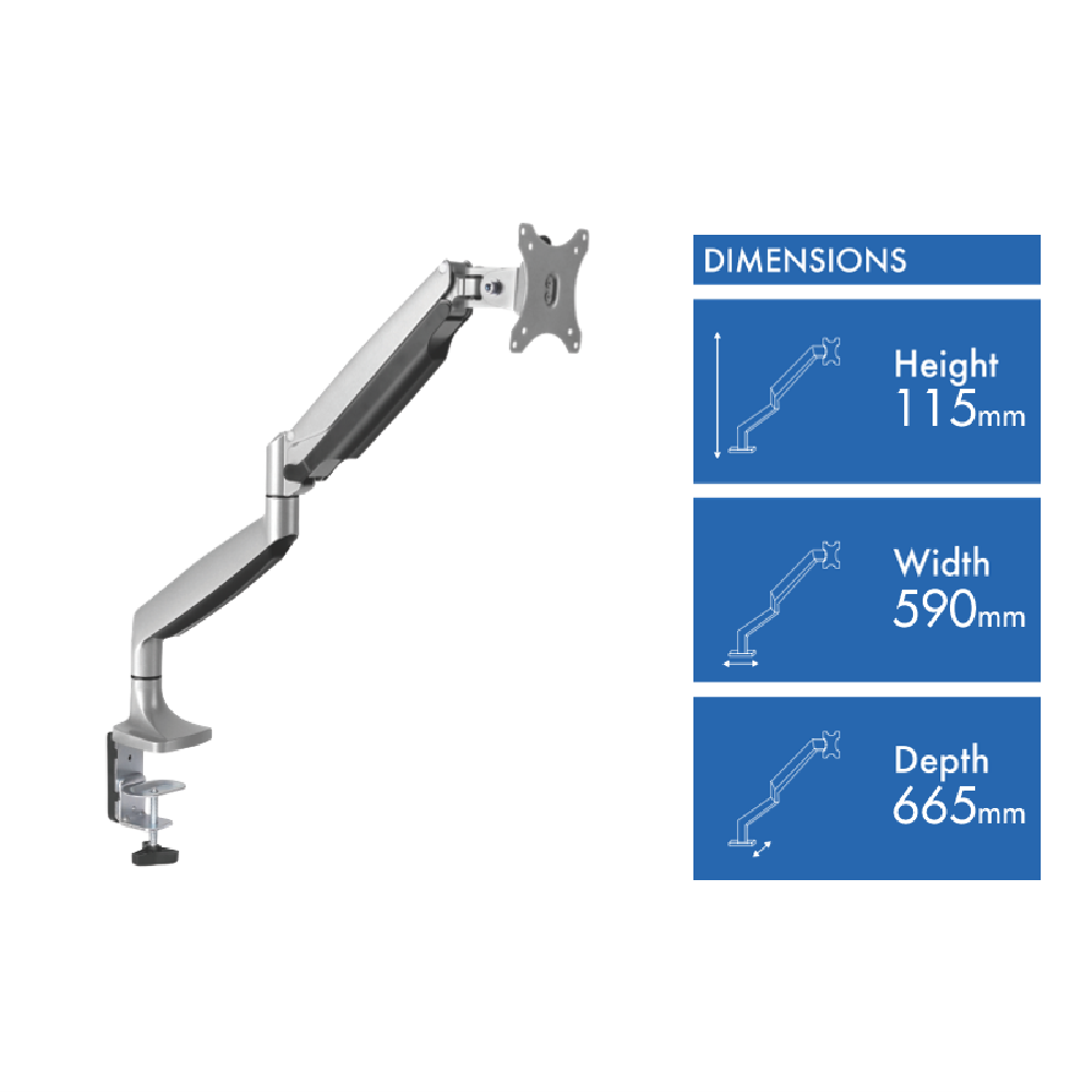 Additional Features 180 degree Rotary VESA plate, Cable management, Grommet and desk clamp mounting available, 1-6.5kg screen weight capacity, Gas spring perfectly counterbalances the weight of your monitor Built-in strut gauge for perfect weight adjustment