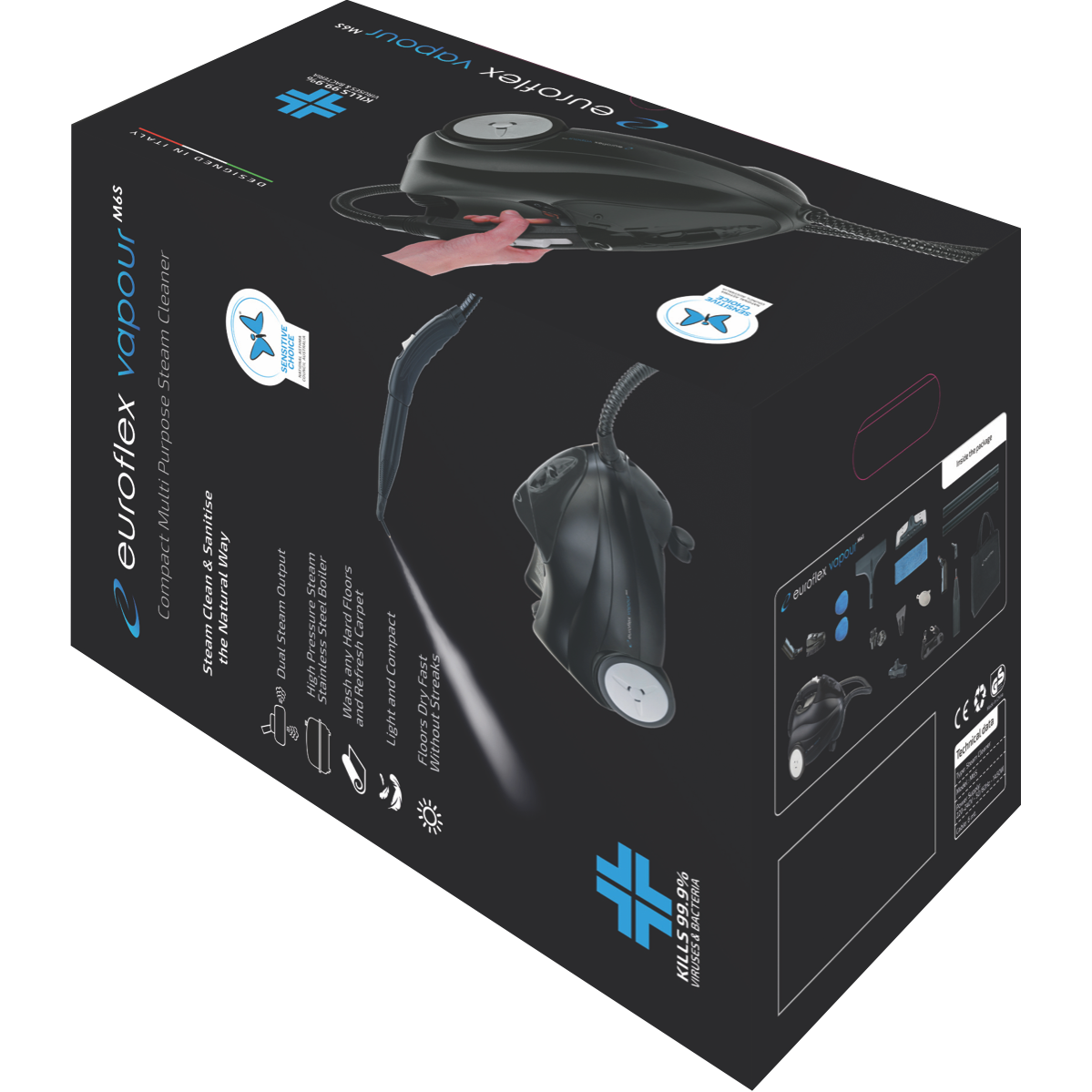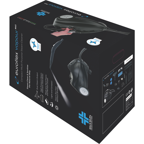 Banish germs and grime with the powerful Euroflex Vapour-M6S Steam Cleaner. This steam mop kills 99.9% of viruses and bacteria for a deeper clean. The generous 1200ml tank capacity provides up to 45 minutes of steam cleaning on hard surfaces. Tackle every room with the 6 metre power cord. Sensitive Choice approval makes this steam mop ideal for asthma and allergy sufferers. The continuous steam helps loosen and lift dirt grease and grime from tiles sealed hard floors benches windows and more. Enjoy sparkling clean floors without using harsh chemicals. The easy-to-maneuver design makes quick work of cleaning bathrooms kitchens and other areas. Simply fill with water plug in and start steaming away dirt. The two steam settings let you customize the cleaning power. Get into corners and tight spaces with the flexible steam head. Say goodbye to scrubbing and elbow grease. Transform your home with the power of steam. Enjoy floors and surfaces that look freshly cleaned. This steam cleaner comes with a 2 year warranty for peace of mind. The manufacturer's part number for this product is 3330272. Consider bringing home the Euroflex Vapour-M6S Steam Cleaner for easy chemical-free cleaning.