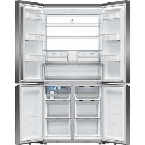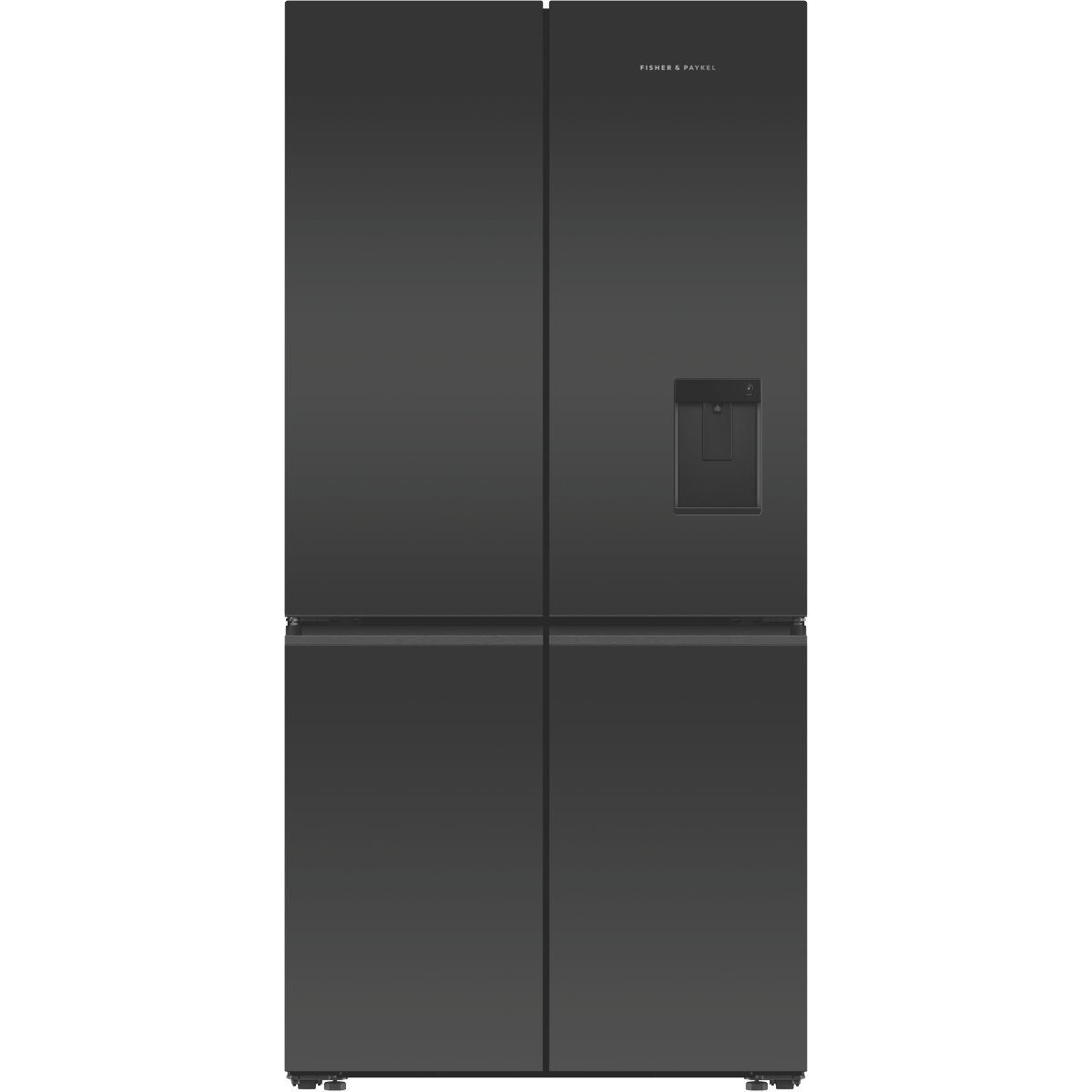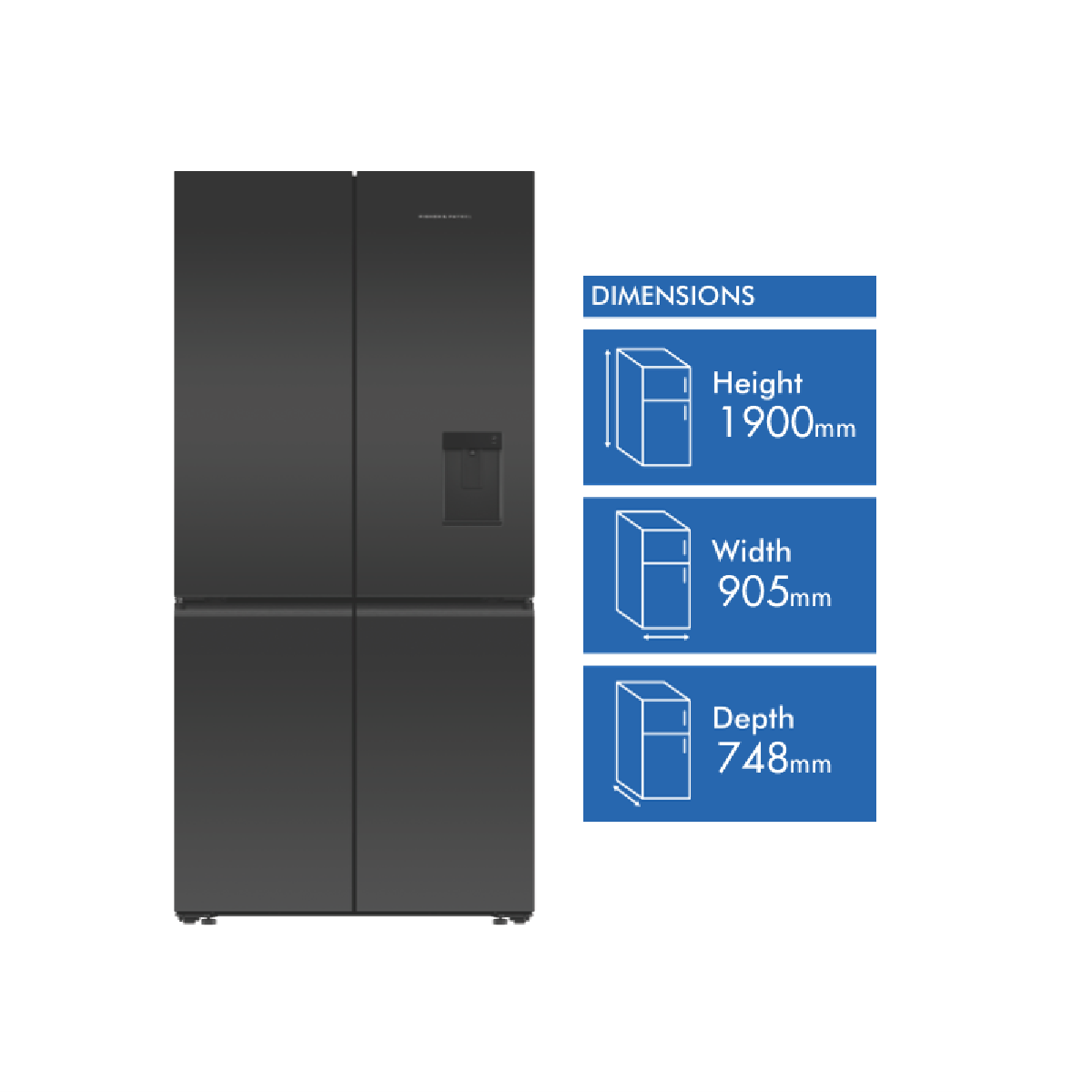 Step up to smart convenience with the Fisher & Paykel 690L Quad Door Refrigerator. This spacious French door fridge provides ample storage for the whole family's fresh food needs. The sleek matte black glass finish and black exterior lend an ultra-modern look while the generous 690 litre total capacity equips you with expansive refrigerator and freezer space. Keep frequently used items right at hand thanks to the quad door design which includes two fridge doors and two freezer drawers. Adjustable storage multiple temperature zones and ActiveSmart technology all help ensure your food stays fresher for longer. Additional useful functions like fast ice making a water dispenser soft freeze mode and chill mode make everyday life easier. Discover the difference smart refrigeration can make - this Fisher & Paykel fridge offers modern style and innovative food care in one brilliant appliance. The manufacturer's part number for this product is RF730QZUVB1.