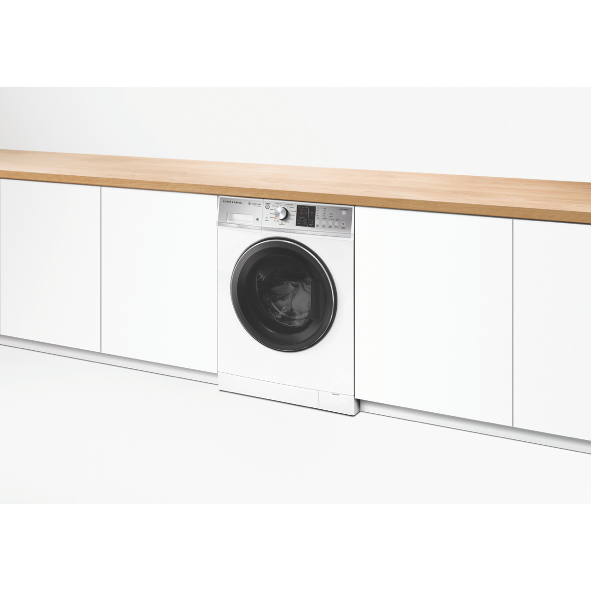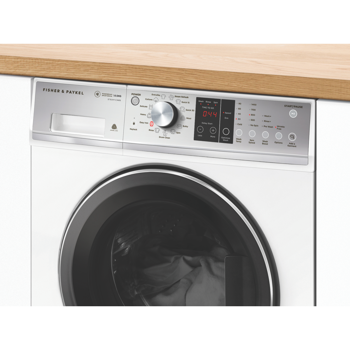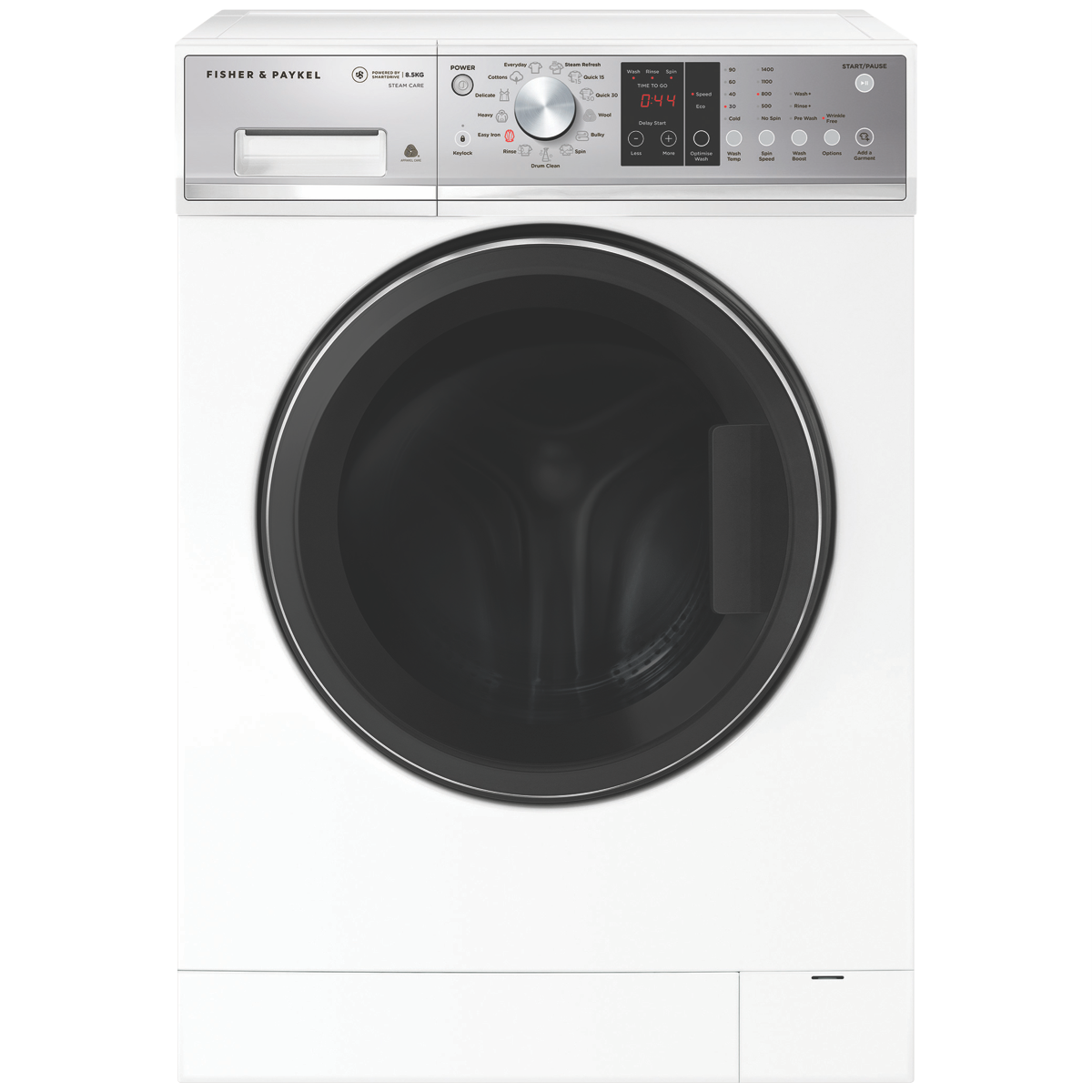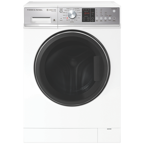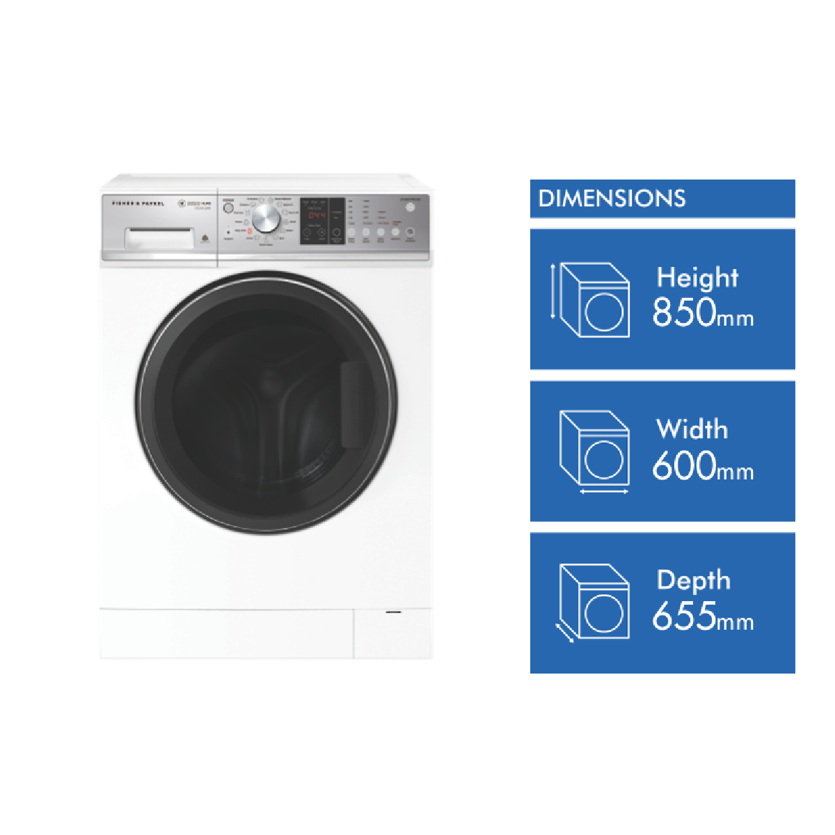 This white Fisher & Paykel front load washing machine has a high 4.5 star WELS water rating and a 4.5 star energy rating for bill savings and the capacity to wash 8.5kg of dry laundry per load so you can easily handle one queen doona. Revive clothing that has been worn and just needs to be freshened up with a quick Steam Refresh cycle that reduces odours and removes wrinkles in just 20 minutes without a full wash cycle maximising the life span of your garments. It has 13 types of washing programs allowing you to select the setting for best washing results. Plus the white Fisher & Paykel WH8560P3's high 1400rpm maximum spin speed enables you to wring all of the moisture out of the clothes fibers. It features a delayed start setting. This white front load washing machine is 850mm high 600mm wide and 645 mm deep so take careful measurements of where your washer needs to fit leaving enough space for the door to open and for a dryer to be wall-mounted above if you want to save floor space.