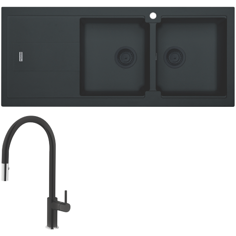 Franke Bali Double Bowl Sink with Left Hand Drainer and Verona Pull-Out Tap - Matt Black