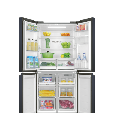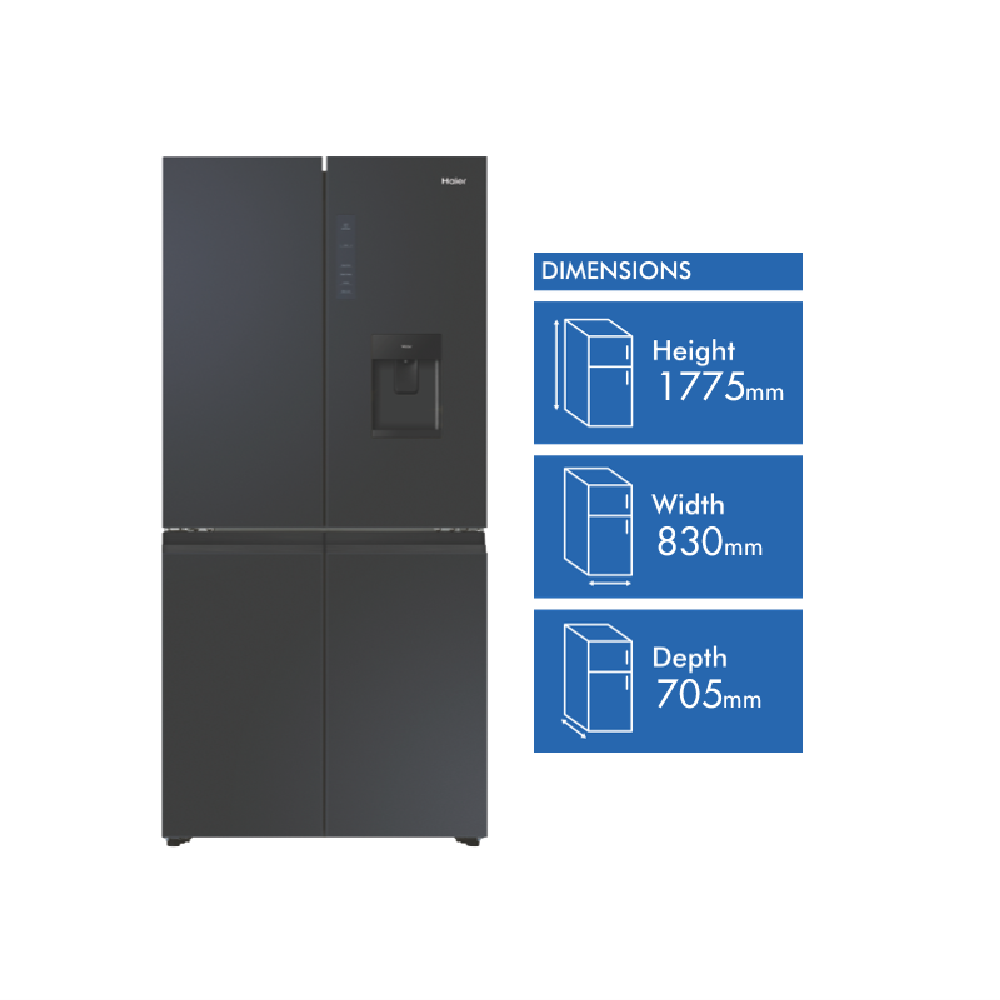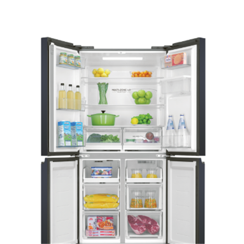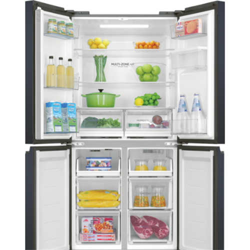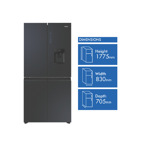Keep your fresh and frozen foods in optimal condition and neatly organised thanks to this Haier 508L Quad Door Refrigerator HRF580YHC. Flexible storage solutions include two adjustable glass shelves to make room for fresh produce drinks and everyday essentials as well as Haier's SwitchZone allowing you to switch between fridge and freezer in the bottom right compartment with a temperature range of between -18°C to +5°C. This Haier fridge has an efficient 4.5 Star Energy Rating a water dispenser and MultiZone Air cooling for effective airflow and maximum freshness throughout.