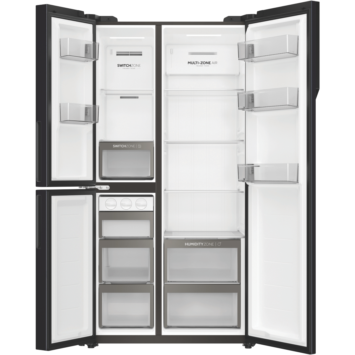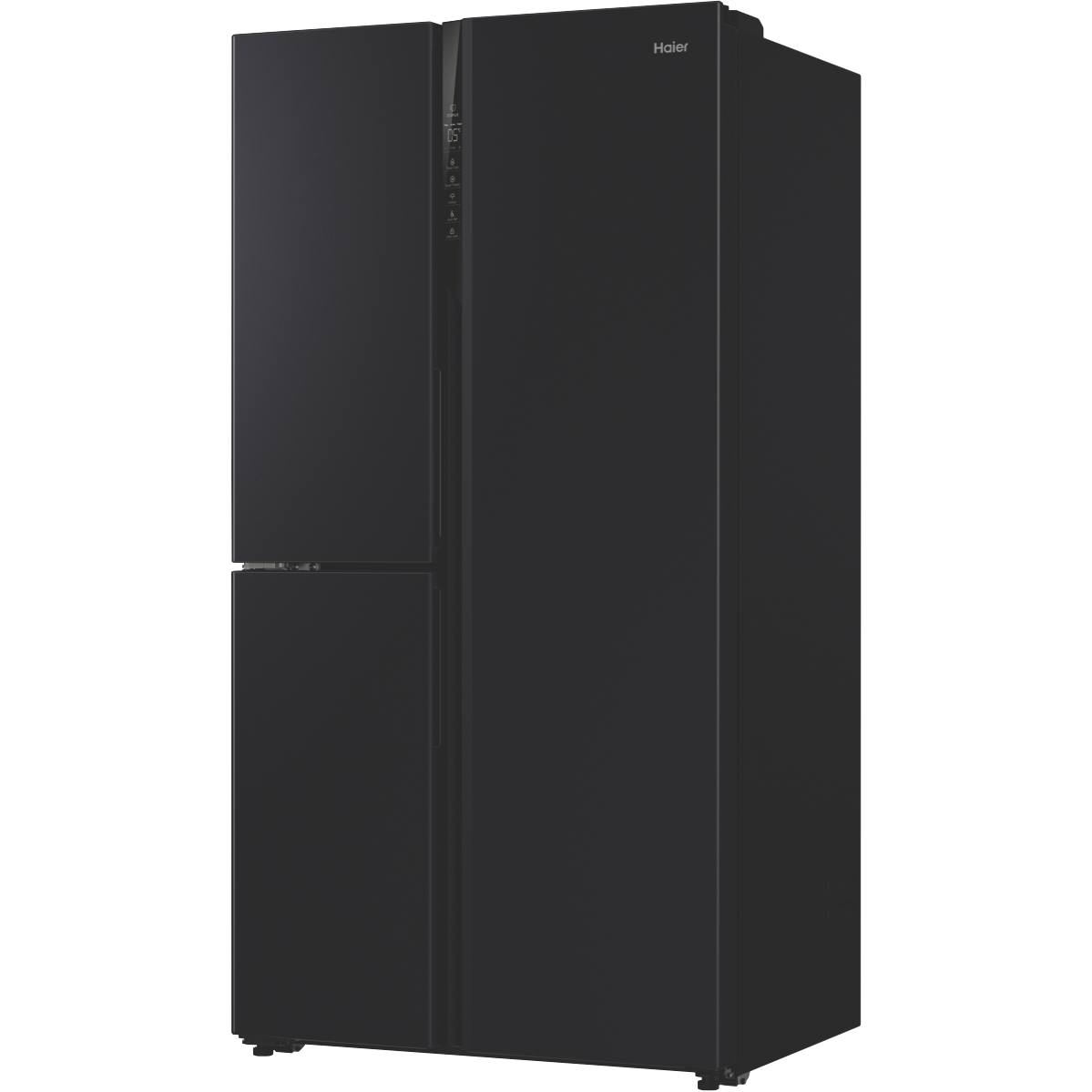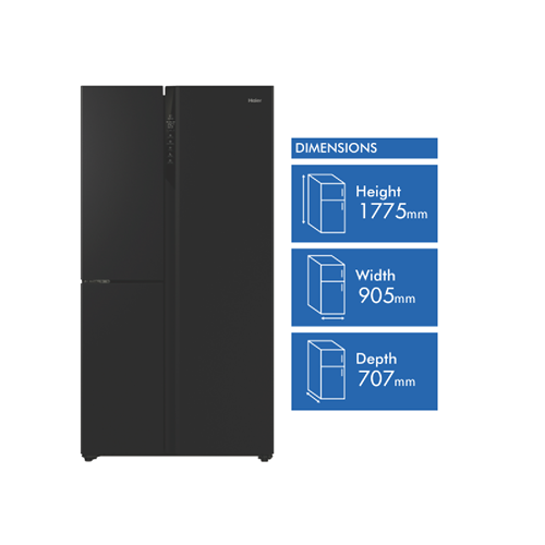 Step up your home with the sleek spacious Haier 574L Side By Side Refrigerator. This large capacity fridge provides ample storage for the weekly shop in an elegant black finish to complement your kitchen. With generous 385 litre fridge space 86 litre freezer capacity and 103L variable temperature compartment you'll never run out of room for fresh ingredients and frozen favourites. The multi-zone air cooling system maintains optimal humidity and temperature control to keep food fresher for longer. Convenient features like the switch zone flexibility between fridge and freezer allow you to adjust the layout to suit your storage needs. The smart lock door gives you quick access to frequently used items. Equipped with a 4 star energy rating and front levelling feet for stability this side by side fridge helps you save power while providing sturdy reliable cooling. Keep your groceries perfectly chilled with the Haier 575L Side By Side Refrigerator. The manufacturer's part number for this product is HRF575XC. Seize the day and enhance your kitchen with an innovative fridge made for modern living.