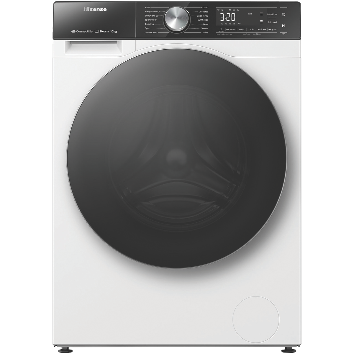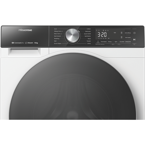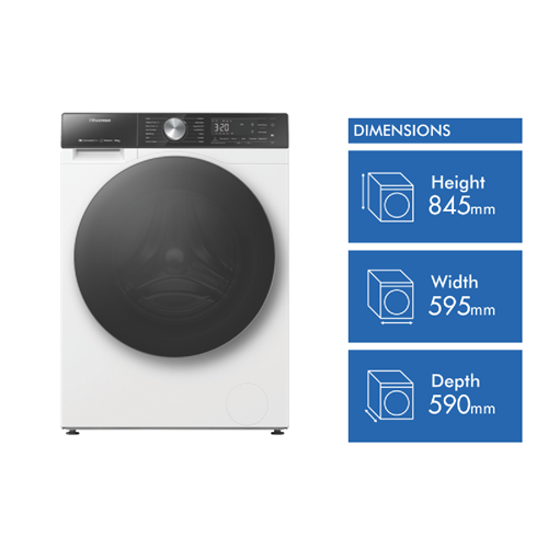 Enjoy effortless and efficient laundry days with the Hisense 10kg Front Load Washer. This white front loader boasts a generous 10kg capacity perfect for handling multiple loads of washing for medium to large households. The powerful 1500rpm spin speed helps remove excess water from your clothes reducing drying time. With a 4.5 star WELS water rating and 5 star energy rating you can save water and energy. The Hisense Washer features 14 versatile wash programs to care for everything from regular cottons to woollens activewear baby clothes and more. The Auto Wash function intelligently senses the optimal wash cycle while Steam keeps clothes fresh and reduces allergens. Delay End lets you schedule wash cycles up to 24 hours in advance for added convenience. Additional features like Pure Jet wash system and Hygiene Guard provide a thorough clean while the Smart Wizard takes the guesswork out of settings. With a matching Hisense dryer available it s easy to create a complete laundry solution. Backed by a 3 year manufacturer s warranty for peace of mind. The manufacturer's part number for this product is HWFS1015E.Bring home the Hisense 10kg Front Load Washer for an effortless laundry experience.