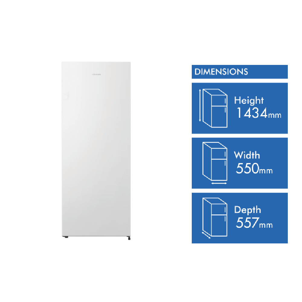 Give your kitchen a sleek modern refresh with the Hisense 155L Vertical Freezer. This spacious upright freezer features a brilliant white finish that will complement any décor. With 155 liters of storage capacity you'll have plenty of room to stock up on frozen foods to feed the whole family. The reversible door and adjustable legs make installation easy while the electronic temperature control lets you customize cooling as needed. Key features like Frost Free technology prevent icy buildup inside and the Super Freeze function rapidly cools items to lock in freshness. The energy efficient 3 star rating helps keep running costs down. With sleek looks and handy storage features this Hisense freezer will be a valued addition to your home. The manufacturer's part number for this product is HRVF155. Discover how convenient and stylish frozen food storage can be with the Hisense 155L Vertical Freezer today.