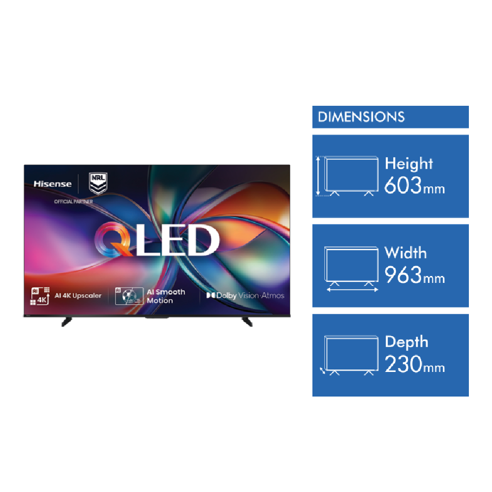 This 43-inch QLED TV brings your entertainment to life with stunning 4K Ultra HD resolution and vibrant Quantum Dot Technology. The 60Hz refresh rate with 120 Motion Rate ensures smooth viewing while the HDR 10 support delivers impressive contrast and detail. Connect wirelessly via Wi-Fi or Bluetooth or use the multiple HDMI and USB ports for all your devices. The VIDAA U7 operating system makes streaming simple and with a 4.5 star energy rating you'll save on power bills too. Comes with a 3-year warranty. Model 43Q6QAU.