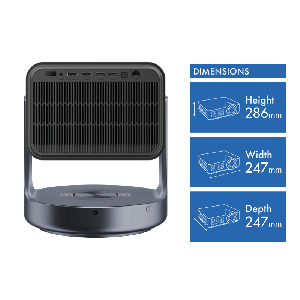 Transform your living room into a home cinema with the Hisense 65 - 300 C2 Ultra 4K Trichroma Laser Mini Projector. This compact powerhouse delivers stunning 4K resolution on screens from 65 all the way up to a massive 300 diagonal. The DLP projection technology creates crisp detailed images with a 16:9 aspect ratio that's perfect for movies and gaming. With a throw ratio of 0.9-1.5:1 you can position it flexibly in your space. Control your entertainment using Amazon Alexa VIDAA Voice or Apple Home and connect easily via Ethernet or Bluetooth. The impressive sound system delivers 40W total output (2x10W+20W) while the 25000-hour bulb life means years of viewing without replacement. Digital keystone correction ensures a perfectly aligned picture even when placement isn't ideal. Weighing just 6.3kg with compact dimensions (247mm x 247mm x 286mm) this smart projector runs on the user-friendly VIDAA operating system. Backed by a 3-year warranty the C2-ULTRA is your ticket to big-screen entertainment.