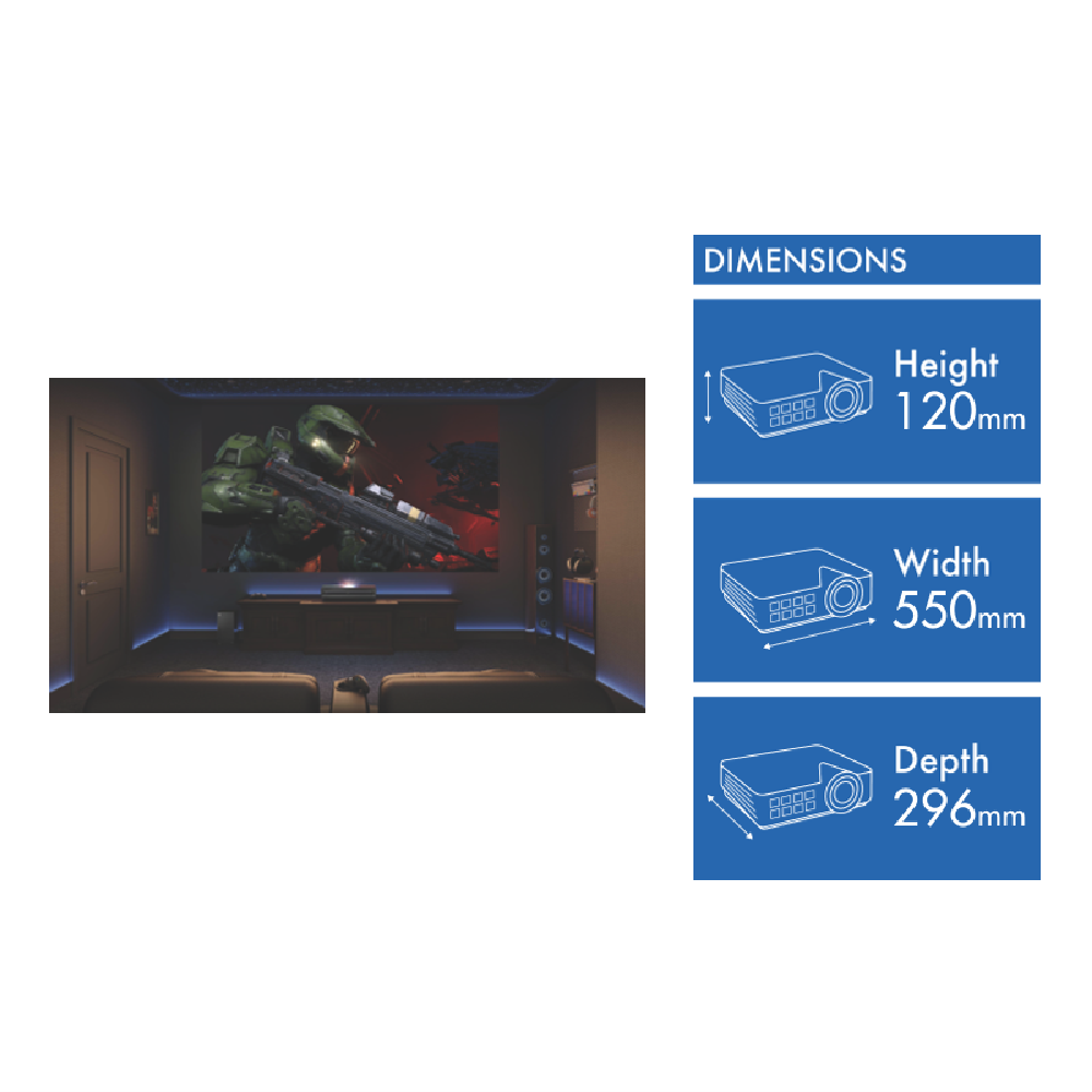 Transform your living room into a home cinema with the Hisense TriChroma Laser Cinema PX3 4K projector. This ultra short throw smart projector creates a stunning picture with its Super Wide Colour Gamut technology displaying 110% of the BT.2020 colour space for incredibly vibrant images. With a throw ratio of just 0.22 you can place it close to your wall and still get a massive screen size at 4K resolution (3840 x 2160). The PX3 includes Dolby Atmos sound for immersive audio that matches the exceptional visuals. Its VIDAA operating system makes streaming content simple while the quad core processor ensures smooth performance. Connect wirelessly to your other devices with ease. The laser bulb lasts up to 25000 hours which means years of entertainment before it drops to half brightness. At 9kg and measuring 550mm wide 296mm high and 120mm deep the PX3 fits neatly into your entertainment setup and comes with a 3-year warranty.