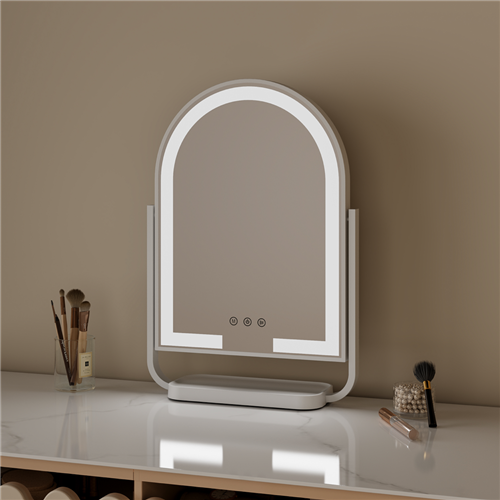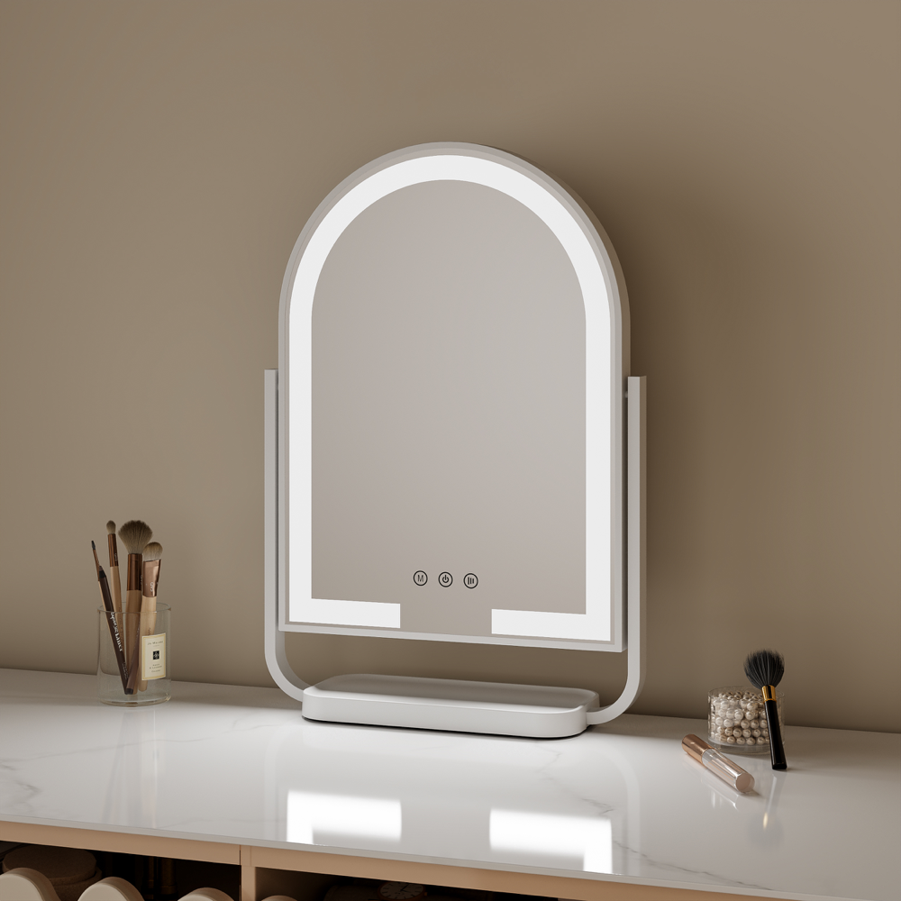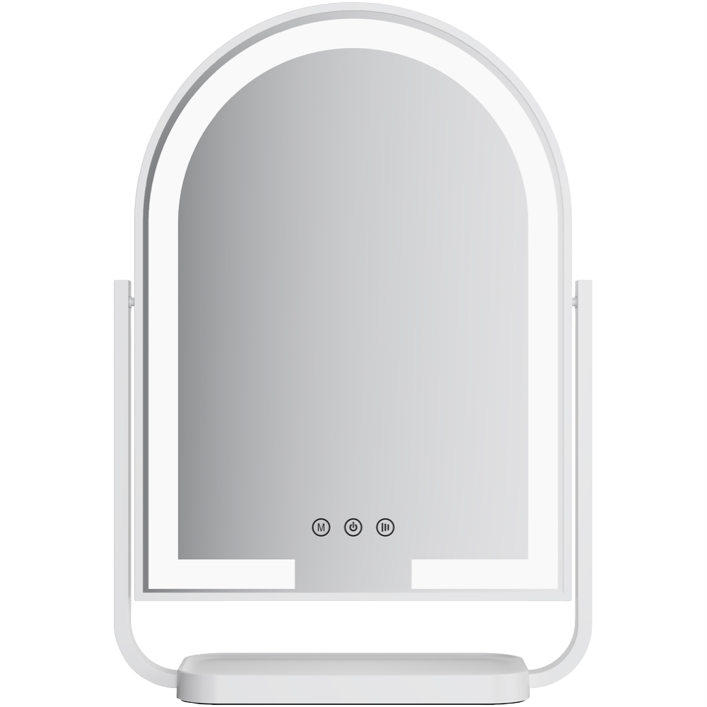 Enhance your beauty routine with the Hollywood Arch Mirror featuring three lighting options - natural cool and warm - all fully dimmable to create your perfect setting. The mirror's 120 LED lights provide excellent illumination while three touch sensor switches make adjustments effortless. For maximum versatility it swivels a full 360 degrees and tilts up to 25 degrees plus includes a 5x magnifying mirror for detailed work. The built-in organiser base keeps your essentials tidy and the cordless design with USB-C charging means no messy cords. Comes with a 1-year warranty. Model MIR-AW100-AU.