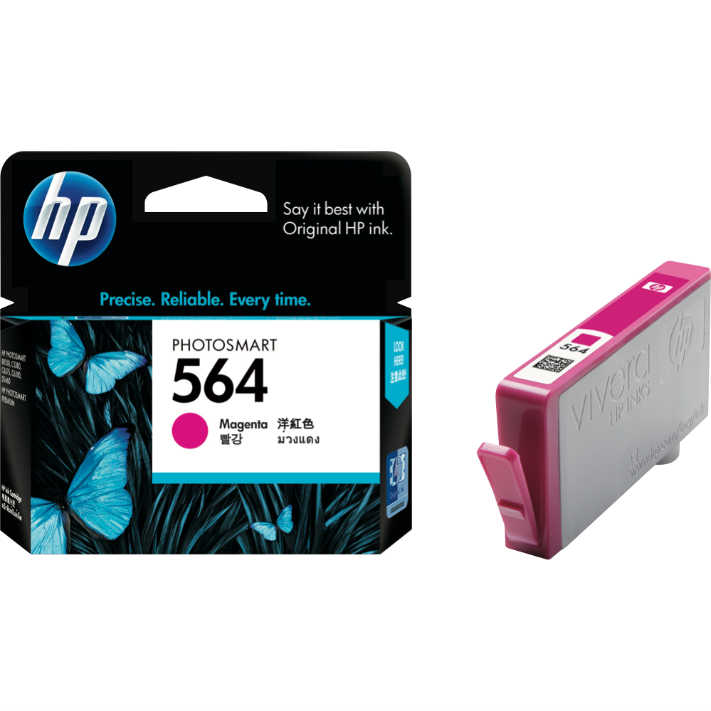 Add a splash of color to documents and photos with the HP 564 Magenta Ink Cartridge. This cartridge produces vibrant magenta prints delivering up to 750 pages of bold color. Designed for use in various HP Deskjet and Officejet printers including the Deskjet 3070A 3520 B109A B110A B111A B209A B210 and more this cartridge allows you to print lab-quality photos laser-sharp documents and attention-grabbing flyers right from your home or office. The quick-drying smear-resistant ink ensures pages come out crisp and clear. Replace faded magenta toner and revive printed materials with rich luminous color. The easy-to-install design makes switching out spent cartridges fast and hassle-free. Make everyday print jobs pop with the long-lasting HP 564 Magenta Ink Cartridge. The manufacturer's part number for this product is CB319WA.