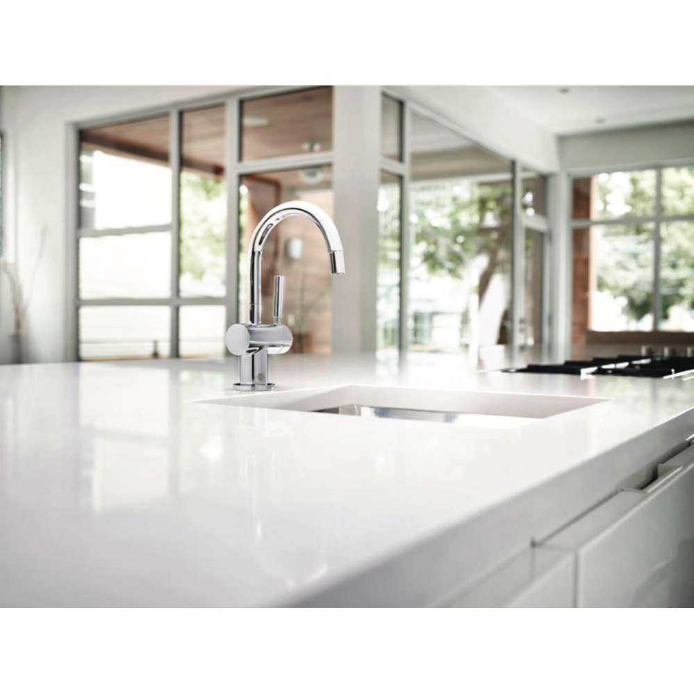 The Insinkerator H3300 Hot Water Only Chrome tap has a hundred different uses to simplify day-to-day kitchen duties. This contemporary tap has stylish modern looks and provides instant access to steaming 98 degrees water right from your kitchen sink. It's always ready when you need it taking away the fuss of waiting for the kettle to boil; allowing you to get the kitchen chores done more efficiently. Whether it's making a tea boiling your rice or pasta thawing out frozen veggies or getting the wash-up done this convenient tap will help you save valuable time. Plus it provides filtered water for safer consumption reducing the chlorine lead and chemicals from the water. The H3300 Hot Water tap is a convenient solution for your modern kitchen.