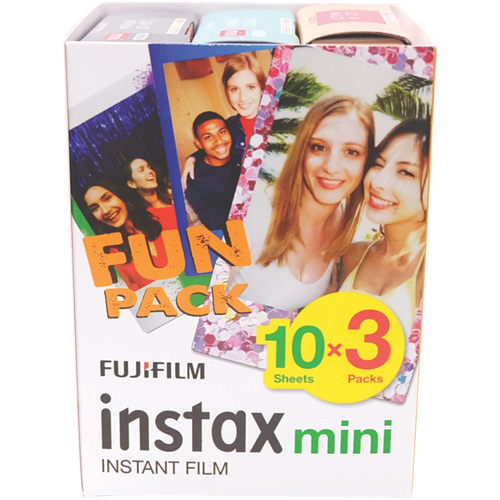 Get creative with this Mini Film Mix Fun 30pk for your instax mini camera or printer. Compatible with any instax mini device including the mini 12 mini 40 mini 90 and mini Link 2 this replacement film produces credit card-sized photos measuring 54 x 86mm. The pack includes 30 sheets giving you plenty of opportunities to capture and print your favorite moments. Model 85256.