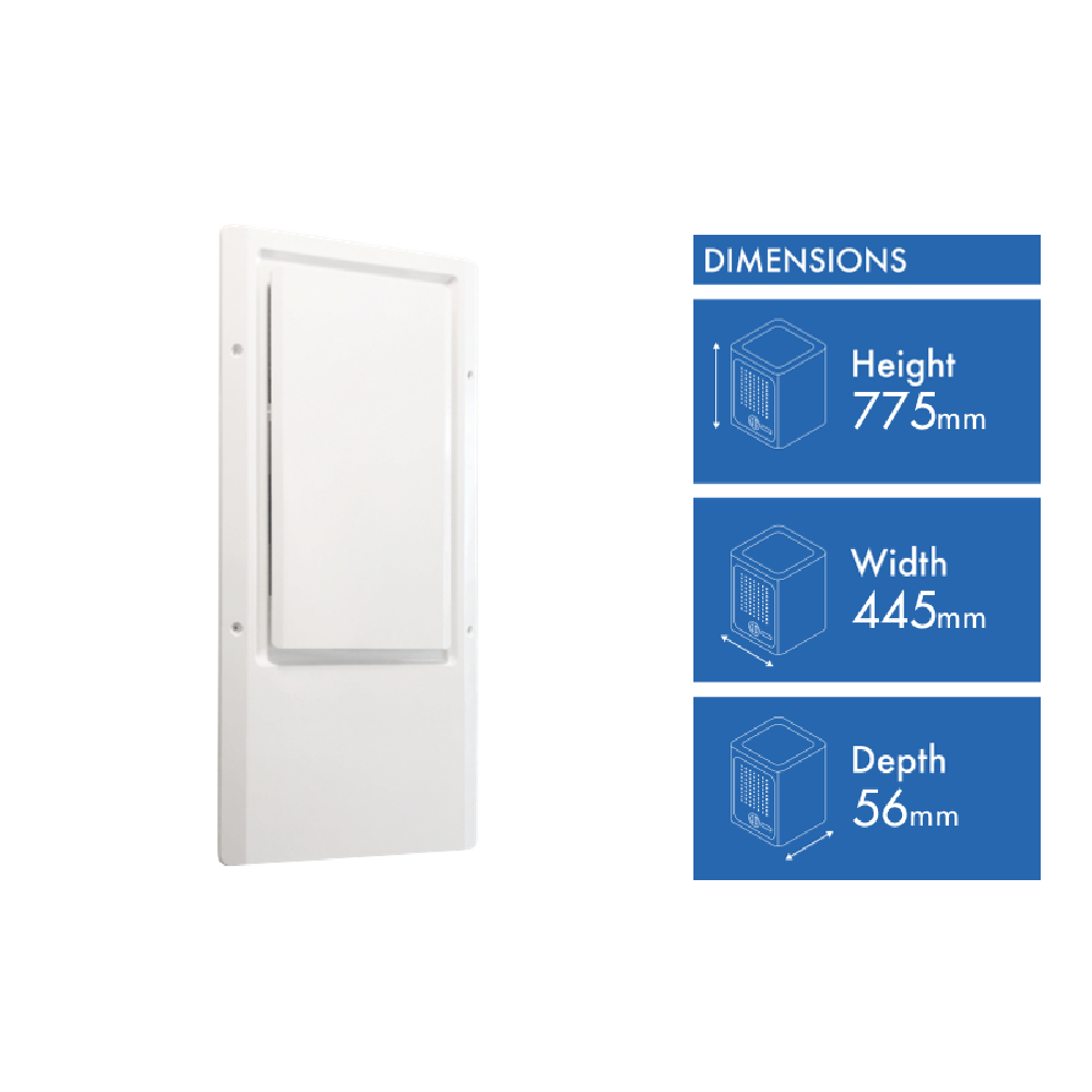 Say goodbye to excess moisture with this IXL in-wall dehumidifier that fits neatly into your home. Perfect for rooms up to 139 square metres it keeps your space comfortable by maintaining your preferred humidity level between 36-90%. The continuous drainage feature means you don't have to empty water tanks manually while its reliable operation in temperatures from 8-35 C ensures year-round performance. Measuring 770mm high 220mm wide and 450mm deep this white dehumidifier integrates discreetly into your space. Weighing 19.5kg and backed by a 5-year warranty it's a durable solution for controlling humidity. Model number: IW25-5-IWD.