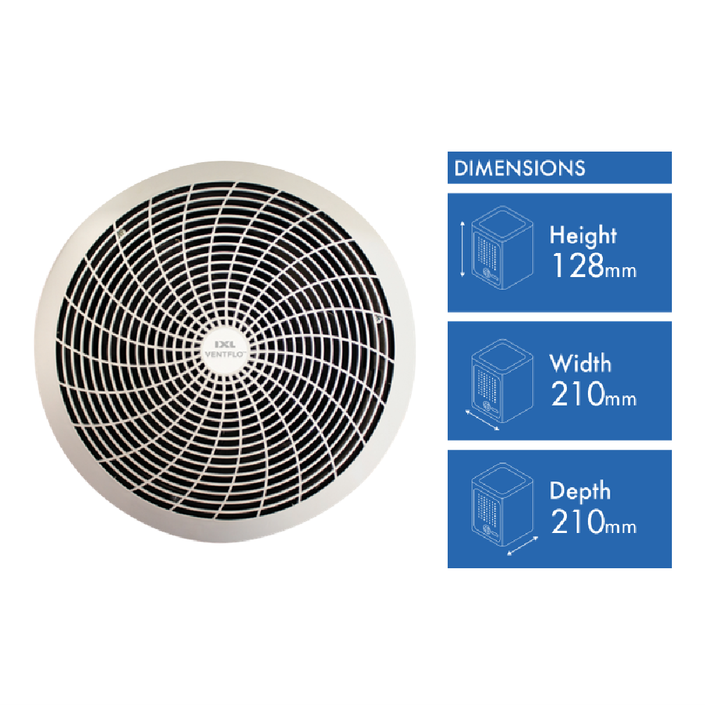 This 200mm IXL Ventflo Extraction Fan keeps your bathroom fresh and dry with powerful yet whisper-quiet operation. Running at just 28 decibels it's about as loud as a soft whisper so you can use it any time without disruption. The impressive 373m /hr extraction capacity quickly removes steam and odours preventing mould and condensation on your mirrors and walls. Installation is straightforward with the included cord and plug while the clean white design (305mm wide and just 14mm in height) blends seamlessly with any bathroom décor. The dishwasher-safe fascia makes cleaning super easy just pop it off and run it through a cycle. Backed by a 2-year replacement warranty for peace of mind. Model number: 10330.