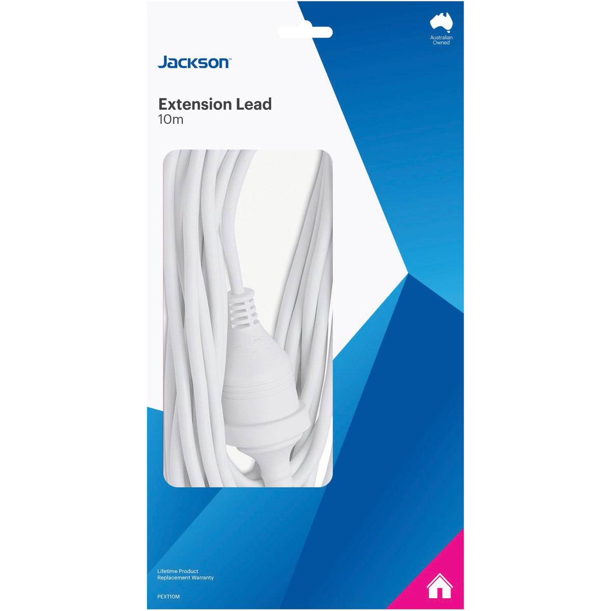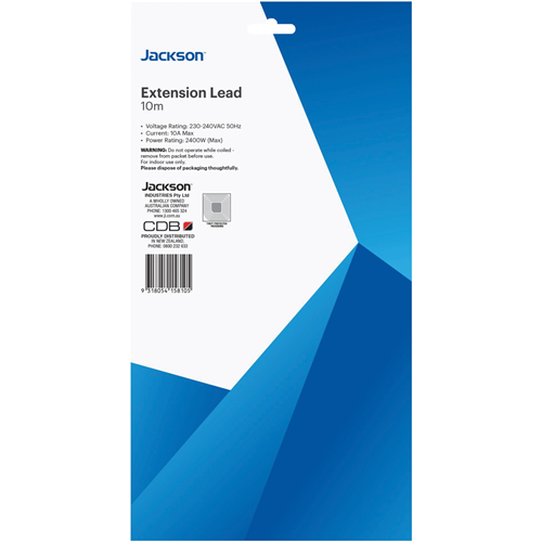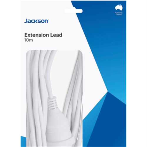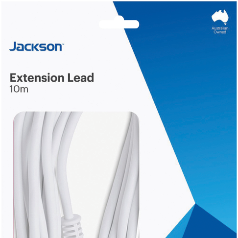 With its 10 metre reach the Jackson 10m Extension Power Lead provides the flexibility and convenience to power appliances far from an outlet. This robust lead features a modern white finish and durable plug and socket built to last. Use it to connect devices like vacuum cleaners power tools heaters fans and more in every room without having to unplug and replug each time. The generous 10 metre cord allows you to manoeuvre around furniture and reach even distant corners of any space. Constructed with safety in mind the tough lead has overload protection to prevent damage to your valuables. Housed in a sleek white casing the lead blends seamlessly into any home decor. Experience the freedom to recharge and power up with ease using the Jackson 10m Extension Power Lead. The manufacturer's part number for this product is PEXT10M. Check it out today for all your power extension needs.