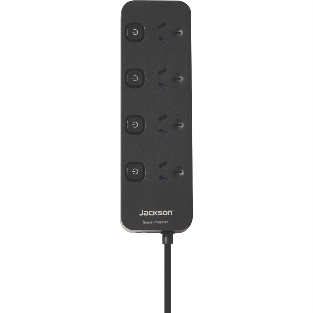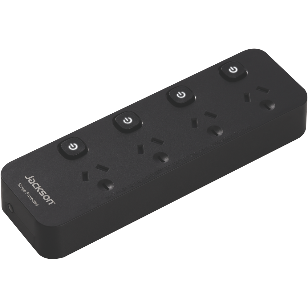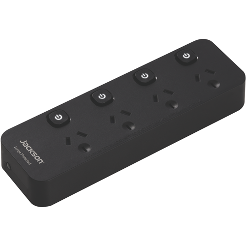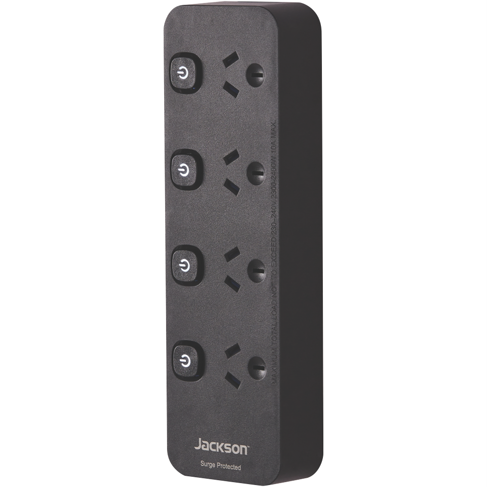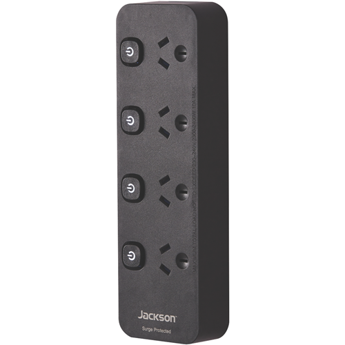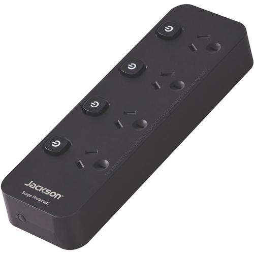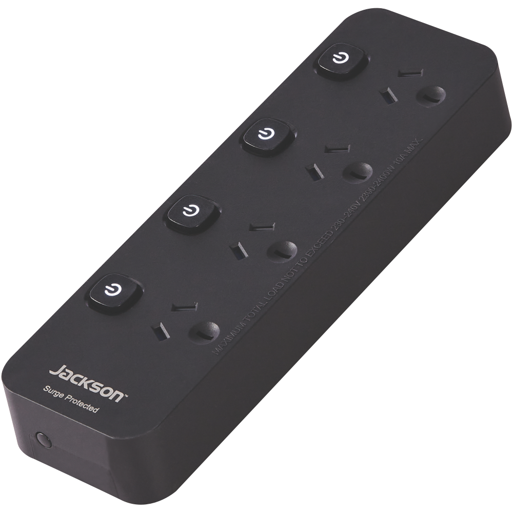 Take control of your power with the Jackson 4 Way Individual Switch Powerboard. This surge protected powerboard allows you to independently switch four outlets on and off making it easy to completely shut off power to individual devices and reduce phantom power draw. With a sleek black design and 1 metre lead it provides both functionality and flexibility. Use the individual switches to cut power to appliances not in use saving you money on your power bill over time. The four widely spaced outlets let you plug in chunky transformers without blocking adjacent sockets. Surge protection provides peace of mind by guarding your precious electronics from power spikes. So if you want to reduce standby power waste and gain finer control over your devices the Jackson 4 Way Powerboard is the smart choice. Rest assured too because this powerboard is backed by Jackson's lifetime warranty. The manufacturer's part number for this product is PT1814. Give your power supply an upgrade with the Jackson 4 Way Individual Switch Powerboard today.