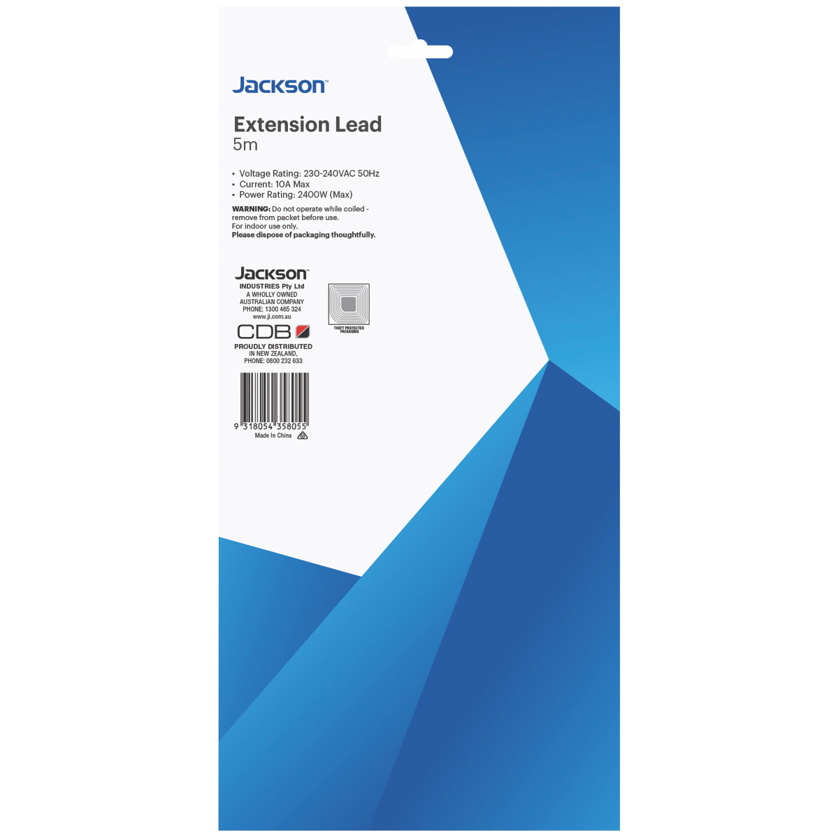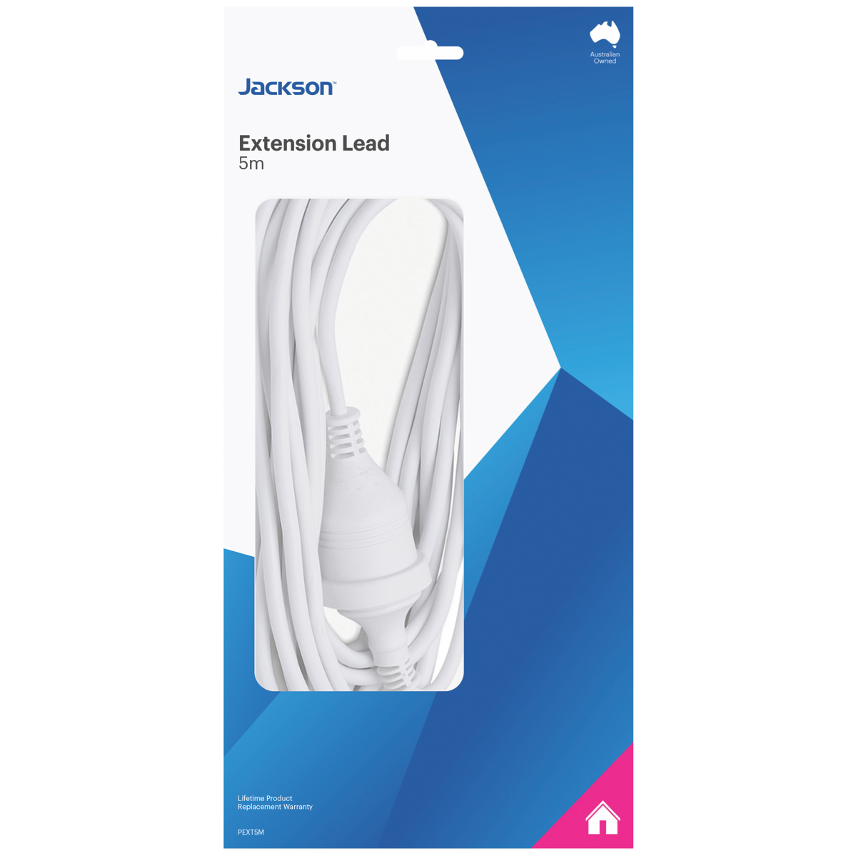 Make life easier with the Jackson 5m Extension Power Lead. This handy extension cord provides 5 metres of extra reach so you can power devices in hard-to-access areas without having to relocate power points. With its durable construction and lifetime warranty you can rely on this lead to deliver reliable performance for years to come. The single outlet lets you connect everything from lamps and fans to chargers and small appliances in any room. So if you need a little more length to your power choose the Jackson Extension Lead. Its generous 5 metre cable lets you conveniently and safely run devices in places standard cords can't reach. The manufacturer's part number for this product is PEXT5M. Don't let your devices be limited by their cords get the flexibility you need with the Jackson 5m Extension Power Lead today.