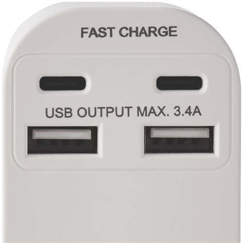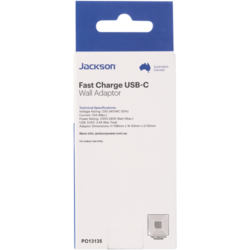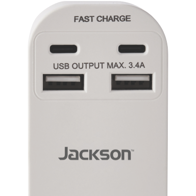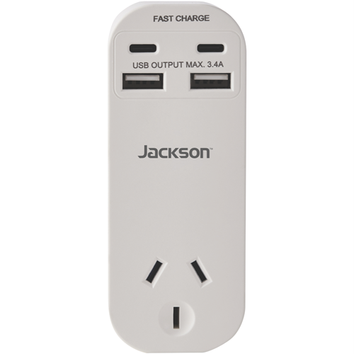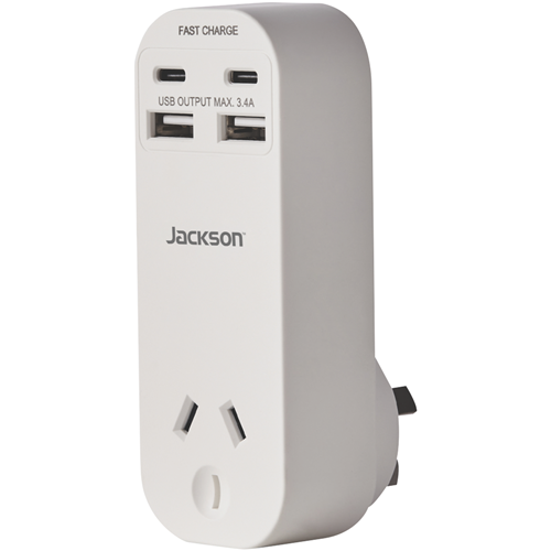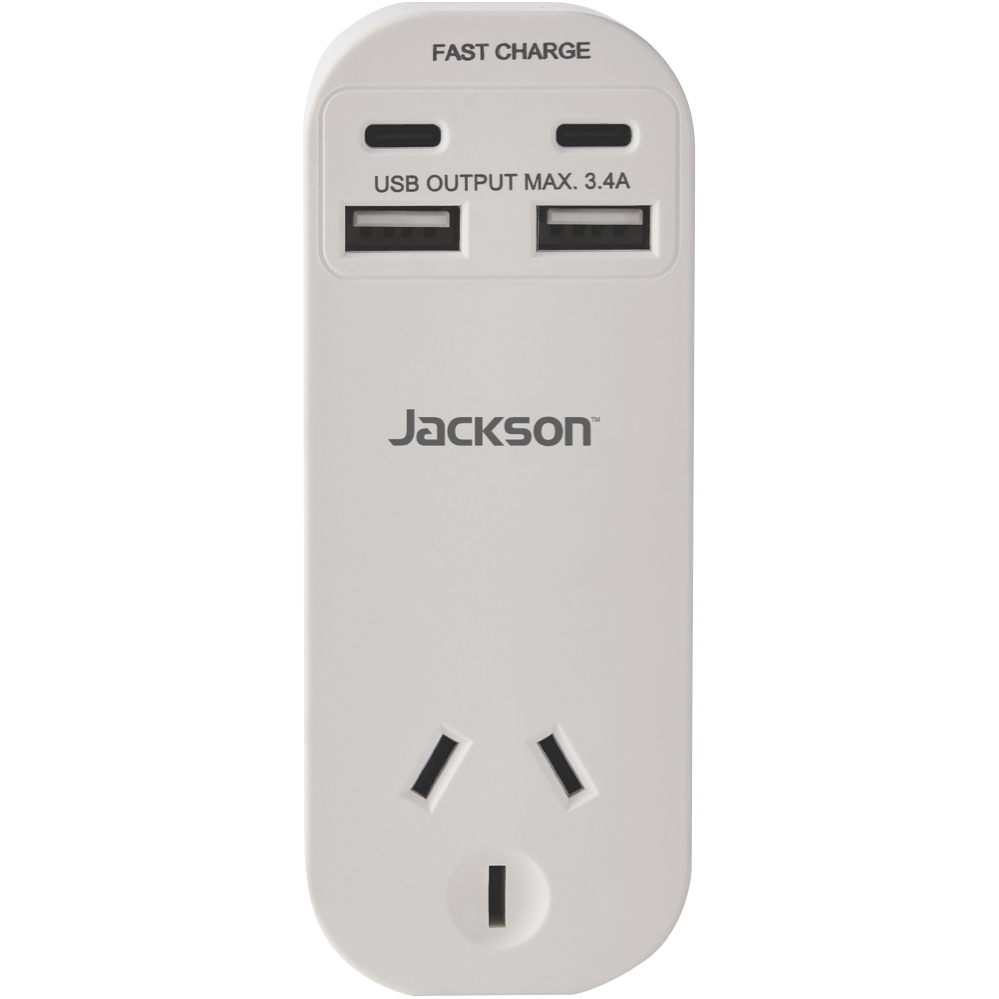 Power up your devices with the Jackson Dual USB-A & USB-C AC Charger. This versatile charger features one outlet and two USB ports along with two USB-C ports to charge everything from phones and tablets to laptops. The dual USB-A ports provide 2.4A shared while the USB-C ports pump out 18W each for rapid charging. With a compact design and foldable plug it's ideal for home office and travel. Charge multiple devices simultaneously without having to hunt for spare outlets. The foldable plug tucks away neatly making it easy to pack in your bag. Compatible with a wide range of devices this charger eliminates the need for multiple chargers. It delivers the optimized charging speed for each connected device. Crafted from durable ABS plastic it's built to last through years of regular use. The manufacturer's part number for this product is PT4USB3C. Give your gadgets the power boost they need with this versatile USB charger from Jackson.