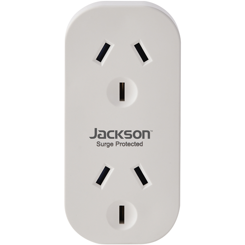 The space-saving Jackson Surge Protected Double Adaptor is the ideal power solution for your home or office. With its vertical design you can plug in two appliances without blocking other outlets. Protect your valuable electronics from power surges and spikes with built-in surge protection. This adaptor provides up to 240V and 10 amps of power across its two outlets. Use it for lamps phone chargers fans and more without worrying about overload. The high-quality adaptor is engineered for safety handling up to 2400 watts. For versatile surge-protected power anywhere choose the Jackson Double Adaptor. Its lifetime warranty provides peace of mind. The manufacturer's part number for this product is PT6400. Check out this surge protector adaptor for your powerboard needs.