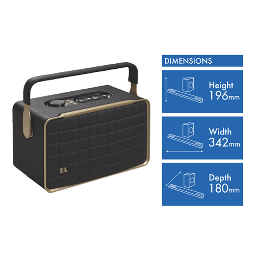 Additional Features Cast aluminium handle and custom leather enclosure give it a retro appeal, Features intuitive controls and the JBL One App (download required), so you can easily customise its settings, 8 hrs Audio Playback Battery Life