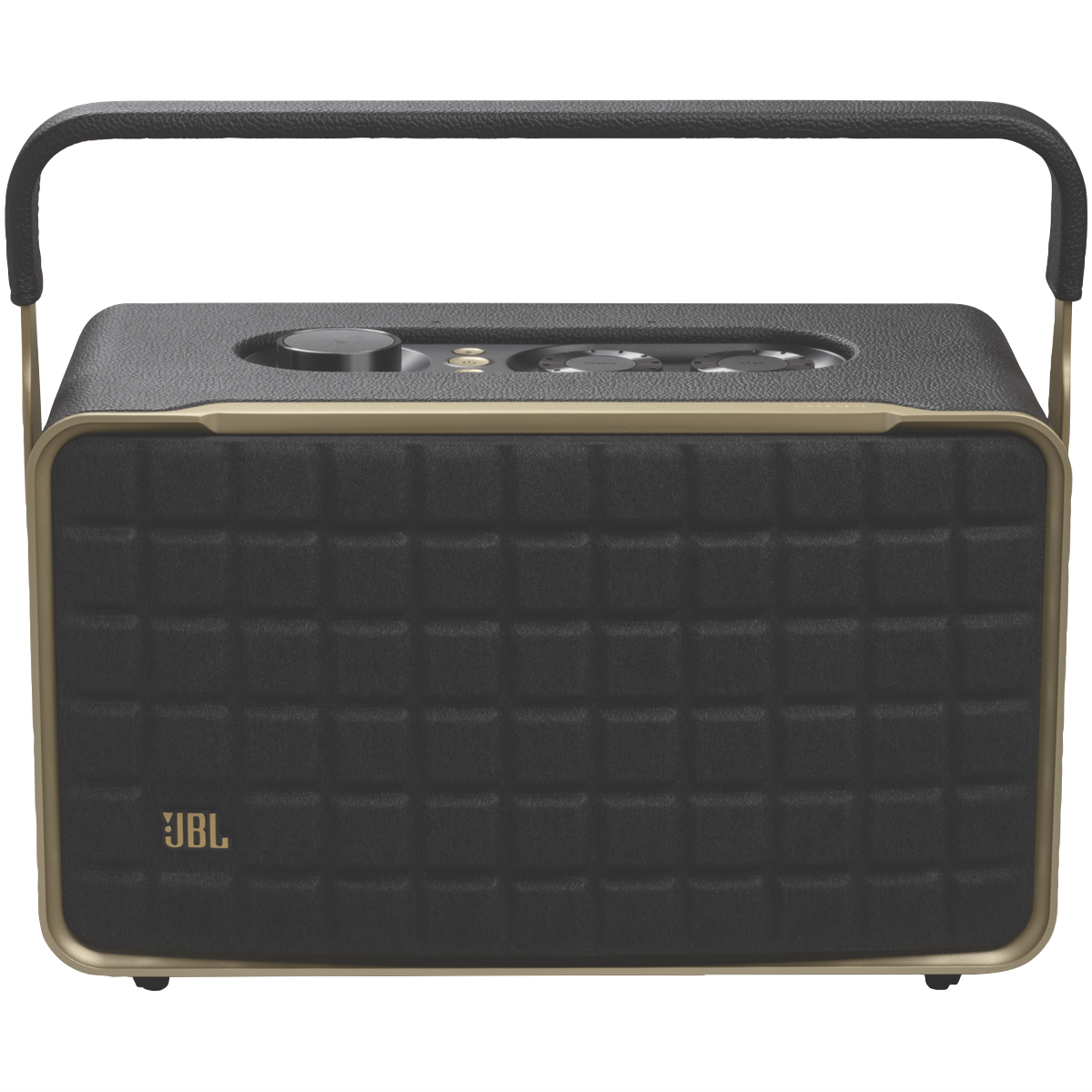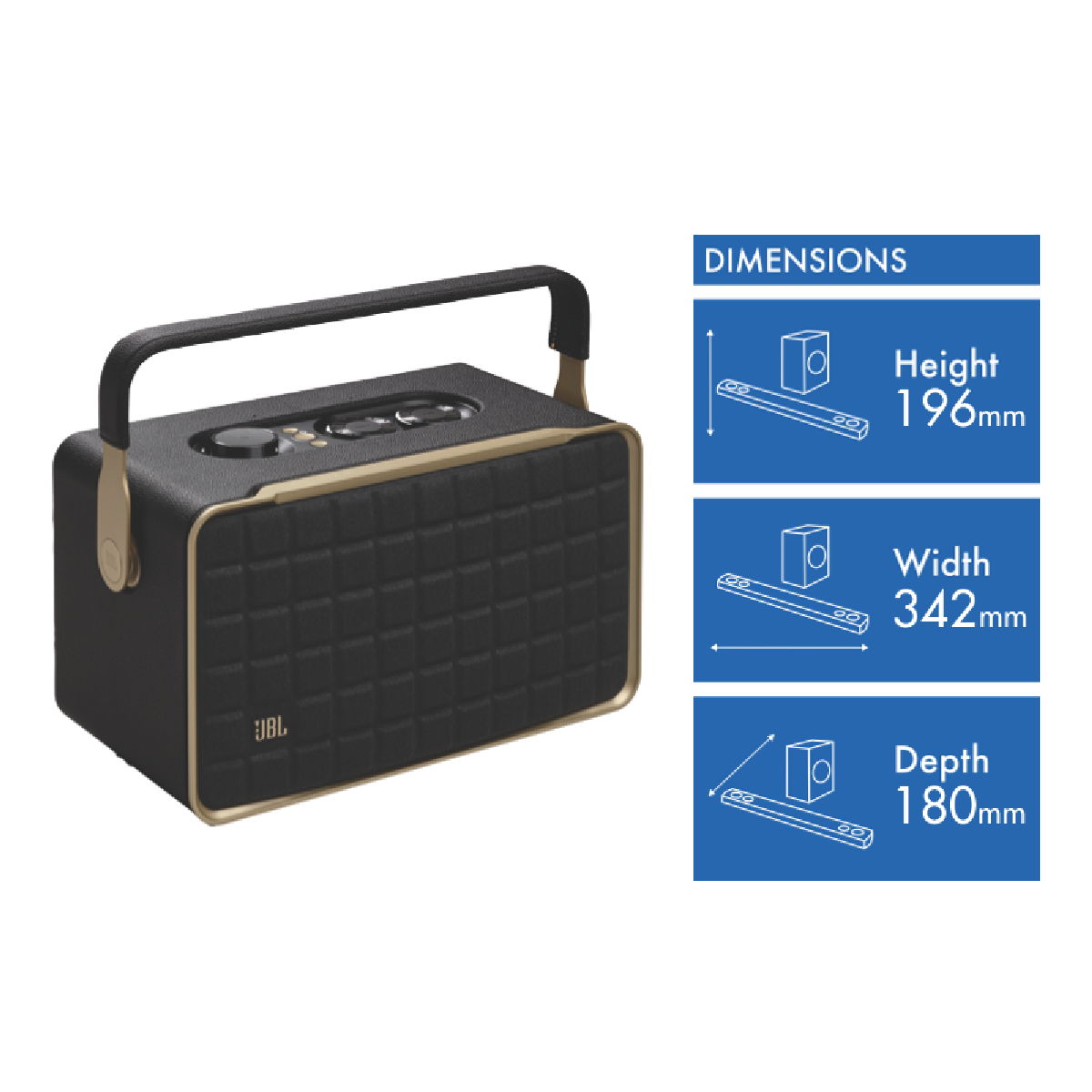 Crafted with premium materials the JBL Authentics 300 Wifi Speaker delivers powerful room-filling sound. This retro-inspired speaker features a cast aluminium handle and custom leather enclosure for timeless appeal. With built-in WiFi and Bluetooth connectivity you can wirelessly stream all your favourite audio from compatible devices. The intuitive controls and JBL One app allow you to easily customise settings for the optimal listening experience. Backed by 100W of total output the JBL Authentics 300 fills your space with rich balanced sound. Plus with integrated Google Assistant and Amazon Alexa you can control your speaker completely hands-free. Measuring 195.6mm high 342mm wide and 180.3mm deep the compact speaker fits into any space while making a statement. It also offers up to 8 hours of audio playback per charge for all-day listening. Give your home audio an upgrade with the JBL Authentics 300's premium design and powerful customisable sound. The manufacturer's part number for this product is 5785773. Check out the JBL Authentics 300 Wifi Speaker today.