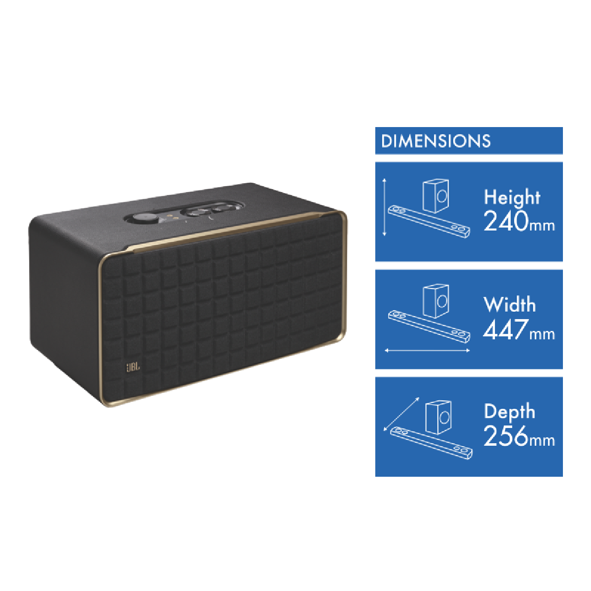 Bring the concert home with the retro-inspired JBL Authentics 500 WiFi Speaker. Its aluminium frame and custom leather enclosure add vintage appeal to any living space while powerful JBL sound fills the room. Connect via WiFi or Bluetooth to stream music from your favourite apps. With built-in Google Assistant and Amazon Alexa you can play tunes get answers and control smart home devices completely hands-free. Customize settings like EQ alarm and sleep timer using the intuitive JBL One app. At 240mm tall 447mm wide and 255.7mm deep this compact yet mighty speaker pumps out room-filling JBL Signature Sound. Enjoy wireless streaming voice assistants and bold retro design with the JBL Authentics 500. The manufacturer's part number for this product is 5785774. Check out the JBL Authentics 500 today to add rich powerful sound to your home.