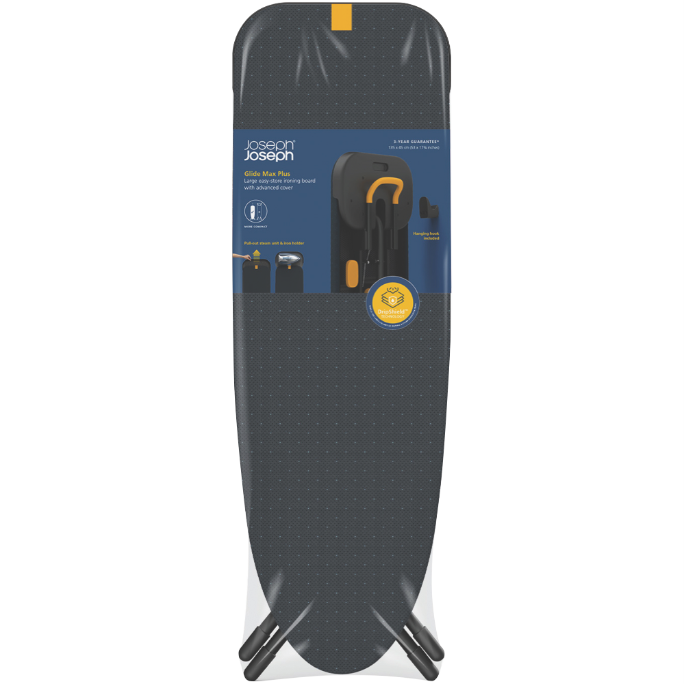 Bring effortless ironing to your laundry routine with the Joseph Joseph Glide Max Plus Ironing Board. This sleek ironing board features a generous 135cm x 45cm ironing surface to tackle all your pressing needs. Its smooth cover glides smoothly under the iron to prevent snagging while the steel frame provides sturdy support. When not in use this ironing board folds down for compact storage with dimensions of 150cm x 47cm x 13cm. Wipe clean the cover and frame regularly with a damp cloth for easy maintenance. Complete with a 5 year warranty the Joseph Joseph Glide Max Plus Ironing Board makes ironing efficient and fuss-free.