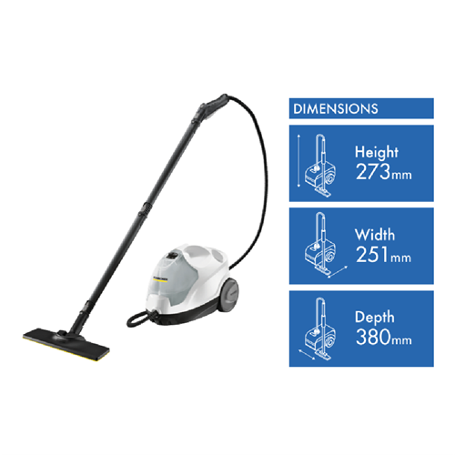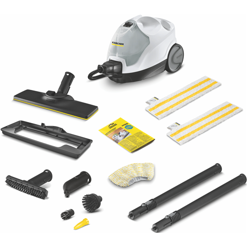 The extremely convenient SC 4 EasyFix Iron Plug cleans without chemicals and can be used anywhere in the home. Using two-step steam regulation the steam intensity can be adapted to the surface and the dirt.Thorough cleaning with the Kärcher steam cleaner removes 99.999% of viruses(1) and 99.99% of all common household bacteria(2) from typical household hard surfaces. Using the right accessories the device ensures exemplary cleaning results on tiles hobs exhaust hoods and even in the smallest of gaps. Even stubborn dirt is reliably removed.The EasyFix floor nozzle features an impressive combination of a flexible joint for excellent ergonomics and lamella technology for perfect cleaning results. Thanks to the convenient hook-and-loop system the floor cleaning cloth can be quickly and easily attached to the floor nozzle and removed again without having to come into contact with dirt.The removable water tank can be permanently refilled for uninterrupted cleaning. Other equipment details: integrated cable storage compartment accessory storage compartment parking position for the floor nozzle. Disclaimers: (1) Through spot cleaning using the Kärcher steam cleaner i.e. steaming for 30 seconds on the maximum steam setting in direct contact with the surface to be cleaned 99.999% of enveloped viruses such as influenza viruses (except the hepatitis B virus) can be eliminated on most smooth hard surfaces in the house (test germ: modified vaccinia Ankara virus).(2) When cleaning at a cleaning speed of 30 cm/s using the maximum steam setting and with direct contact with the surface to be cleaned 99.99% of all common household bacteria on common smooth hard household surfaces are killed (test germs: Enterococcus hirae).