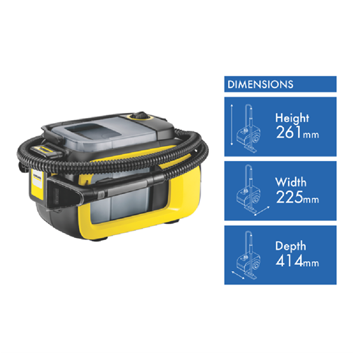 • 18 Volt battery, cordless, compact design, hose storage