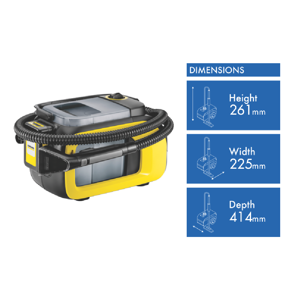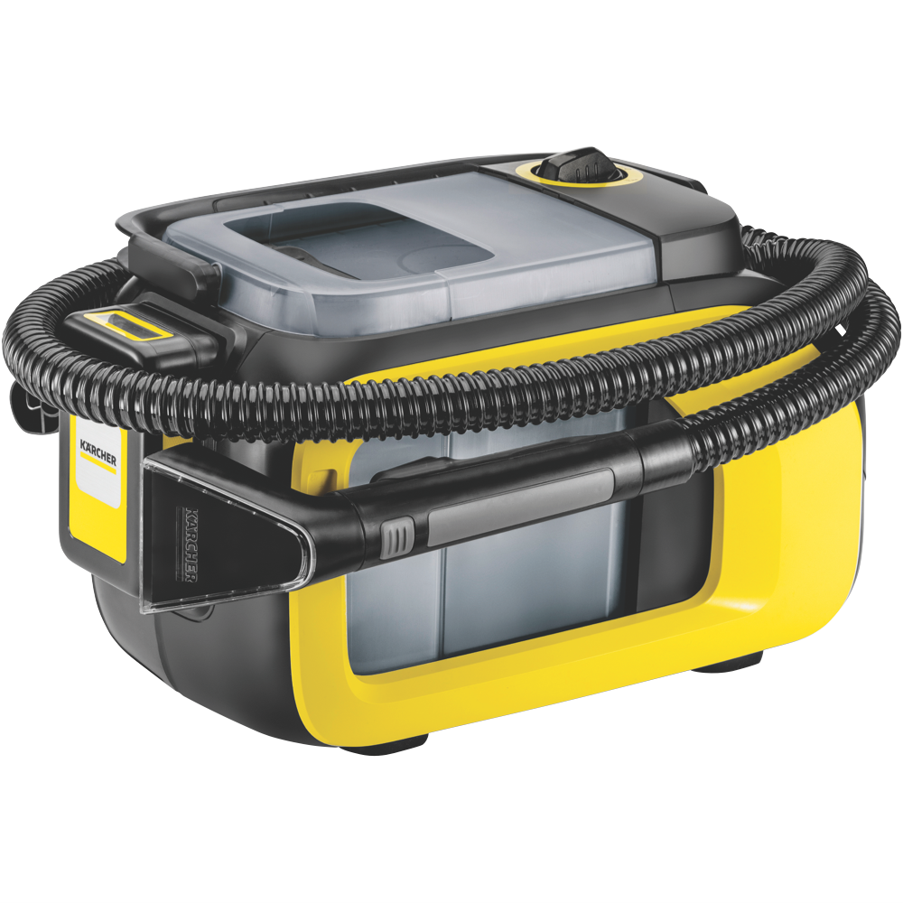 Conveniently freshen fabrics and upholstery with the Karcher SE 3-18 Ultra Clean Compact Cordless Spot Cleaner. This compact and portable spot cleaner delivers powerful cleaning thanks to Karcher's innovative cordless technology. The 1.7L fresh water tank and 2.9L dirty water tank allow you to tackle stains without constantly refilling. Weighing only 3.64kg it is lightweight and easy to maneuver into tight spaces. Key features include the convenient cordless design compact size large water tank capacity and lightweight build. This spot cleaner comes equipped with a fast 18V charger suction hose upholstery nozzle and crevice nozzle to handle all your cleaning needs. Karcher provides a 2 year warranty for added peace of mind. Refresh fabrics and lift stains with the Karcher SE 3-18 Ultra Clean Compact Cordless Spot Cleaner. Order today.