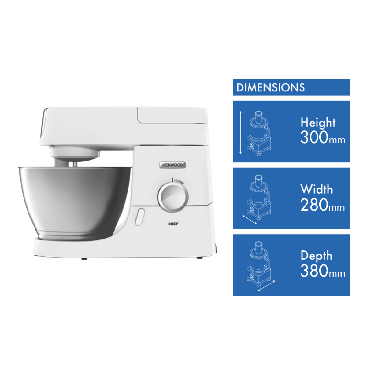 Revolutionize your kitchen with the Kenwood Chef Kitchen Machine White a powerful stand mixer that will become your culinary companion for years to come. This versatile appliance features a robust 1000W motor and variable speed control to effortlessly knead dough beat cake batters and whip cream with precision. The die cast brushed metal construction provides durability for daily use while the 4.6L stainless steel bowl handles large batches with ease. With the aluminium K-beater stainless steel whisk and aluminium dough tool included you'll have all the attachments needed to mix blend and stir ingredients. Designed for stability the Kenwood Chef has a wide base and weighs 7.3kg to stay planted on your countertop during use. The splashguard minimizes messes so you can confidently create masterpieces. Cleanup is a breeze as the bowl is dishwasher safe. Unleash your inner chef with the Kenwood Chef Kitchen Machine White and craft delectable delights for the whole family. The manufacturer's part number for this product is KVC3100W. Bring home this versatile stand mixer and see how it can inspire your cooking today.