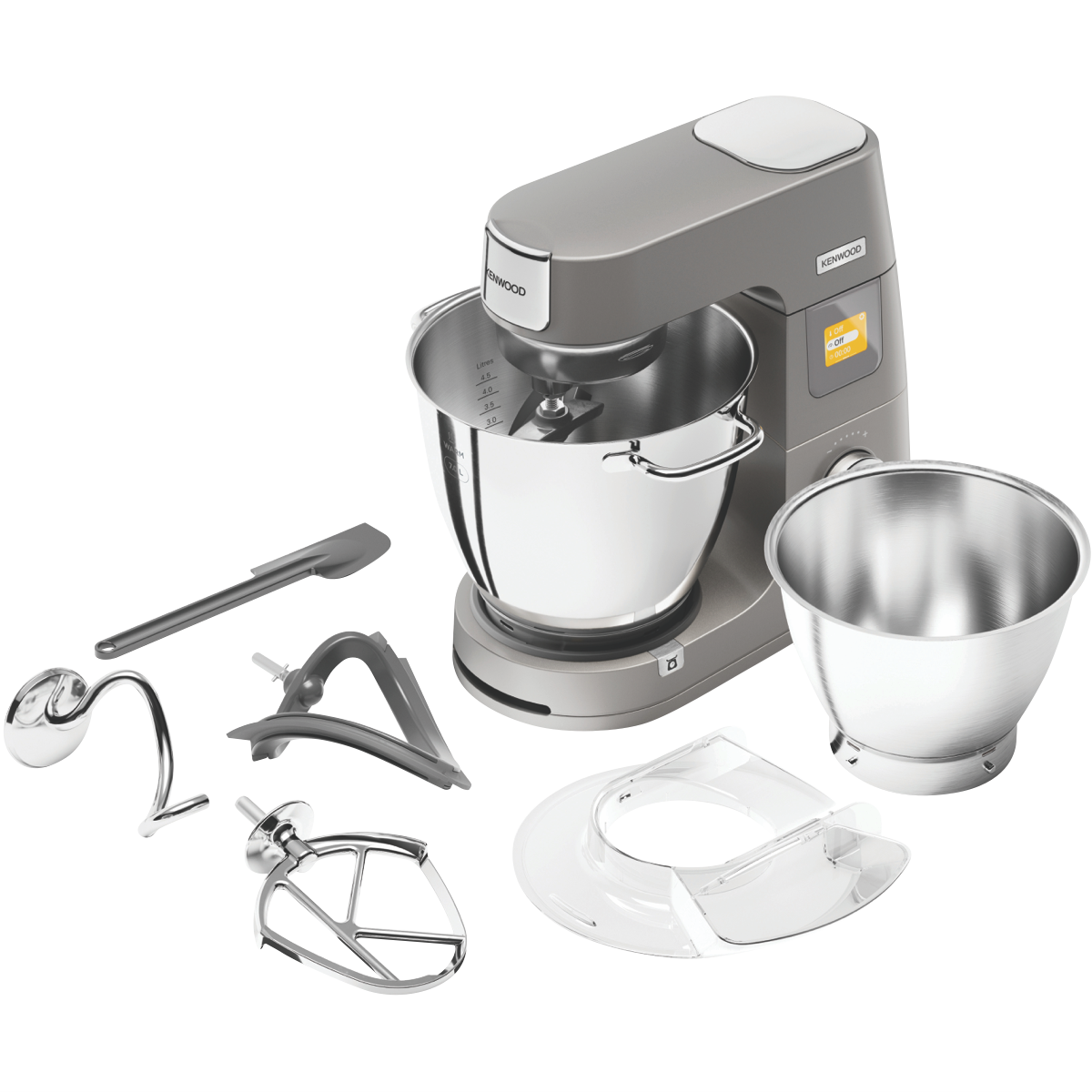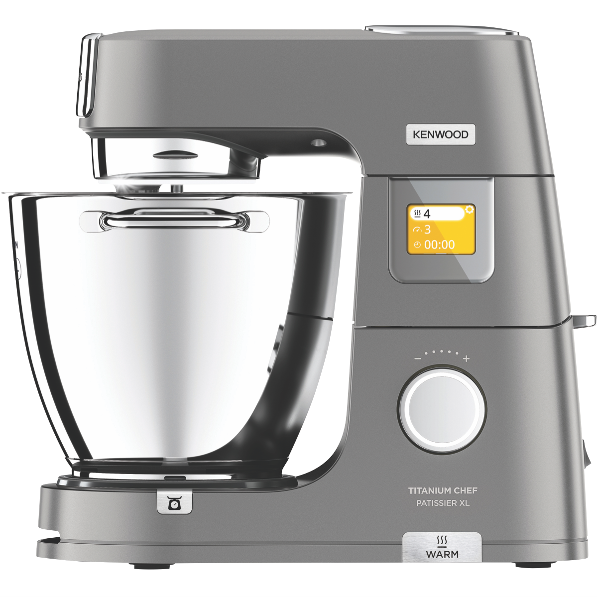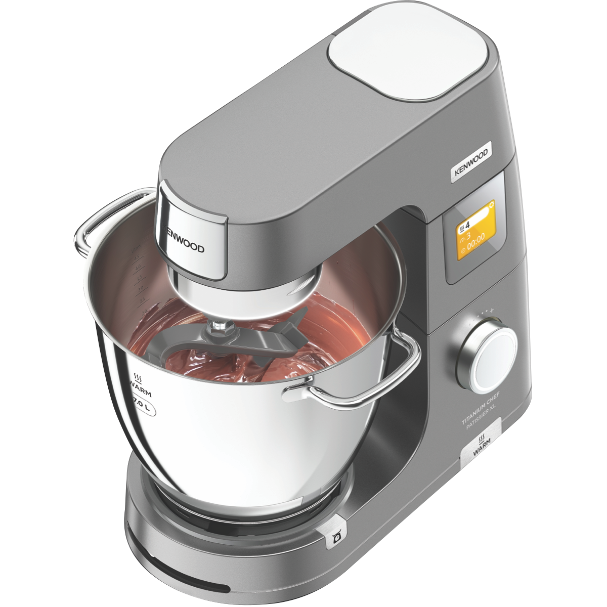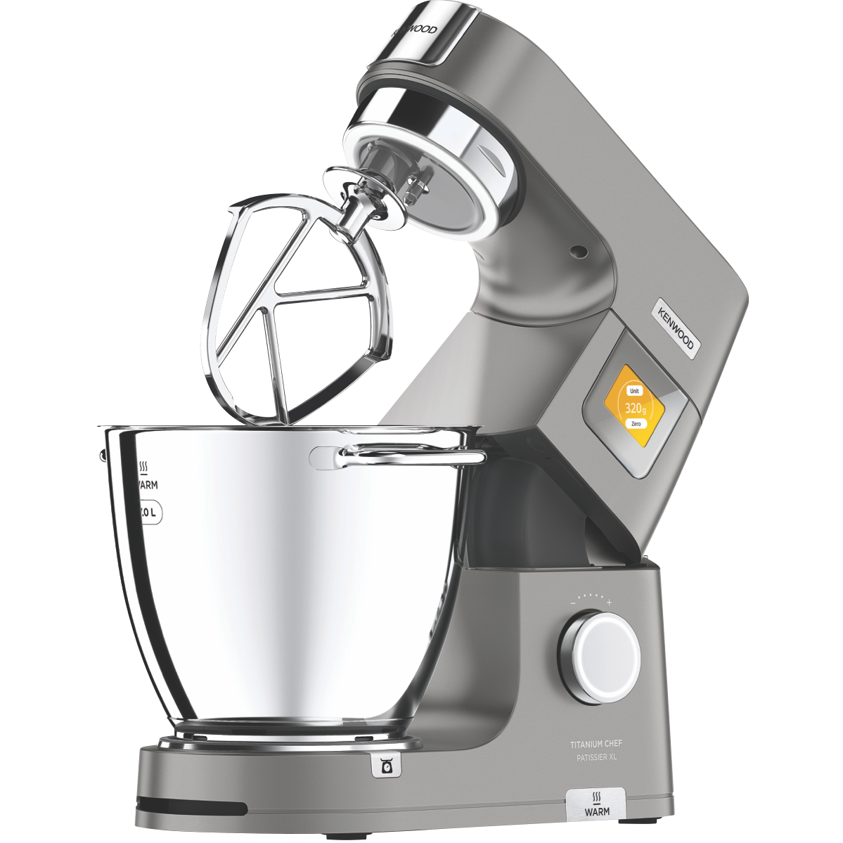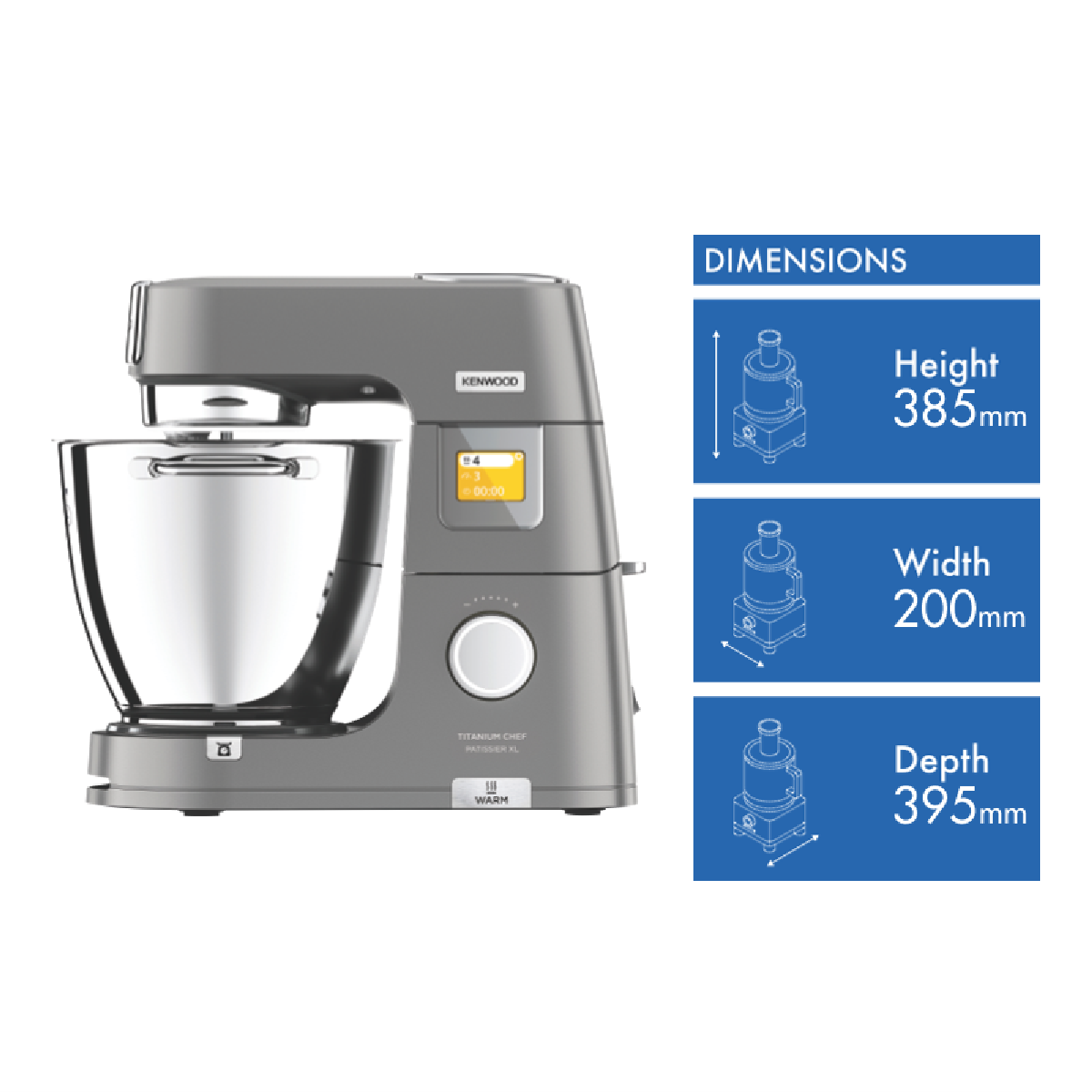 Expect and receive more out of your mixer with the Kenwood Titanium Patissier Mixer KWL90004SI. Using the robust 1400W digitally controlled ChefMotor you can process through every preparation task with ease. The 7L EasyWarm bowl can be heated during mixing to offer you a variety of useful benefits; melt chocolate 33% faster create amazing Swiss Meringue and proving dough is reduced by a third. Quickly weighing your ingredients using the Titanium Patissier Mixer's in built EasyWeigh scales; it actively measures while preparing your mixture. Cut down your preparation time is the 2.4-inch BakeAssist touchscreen; the 6 SimpleTouch food pre-sets allow the Mixer to do the work while you to focus on other tasks. Slice spiralize shred juice grate and blend a wide range of ingredients using over 25 optional Kenwood mixer attachments. Everyday able to always rely on the durability and strength of your mixer; the premium metal body and head lift and high grade stainless steel tools offer sustainable and vigorous performance. Kenwood ensures the quality of the Titanium Patissier Mixer with a 10 Year Motor Guarantee.