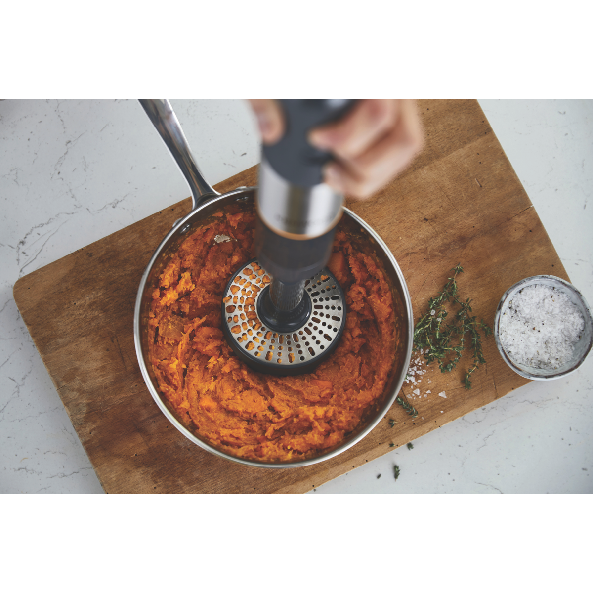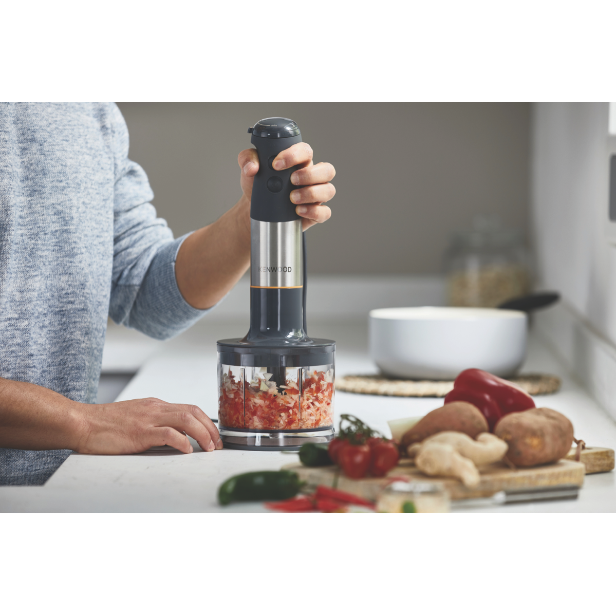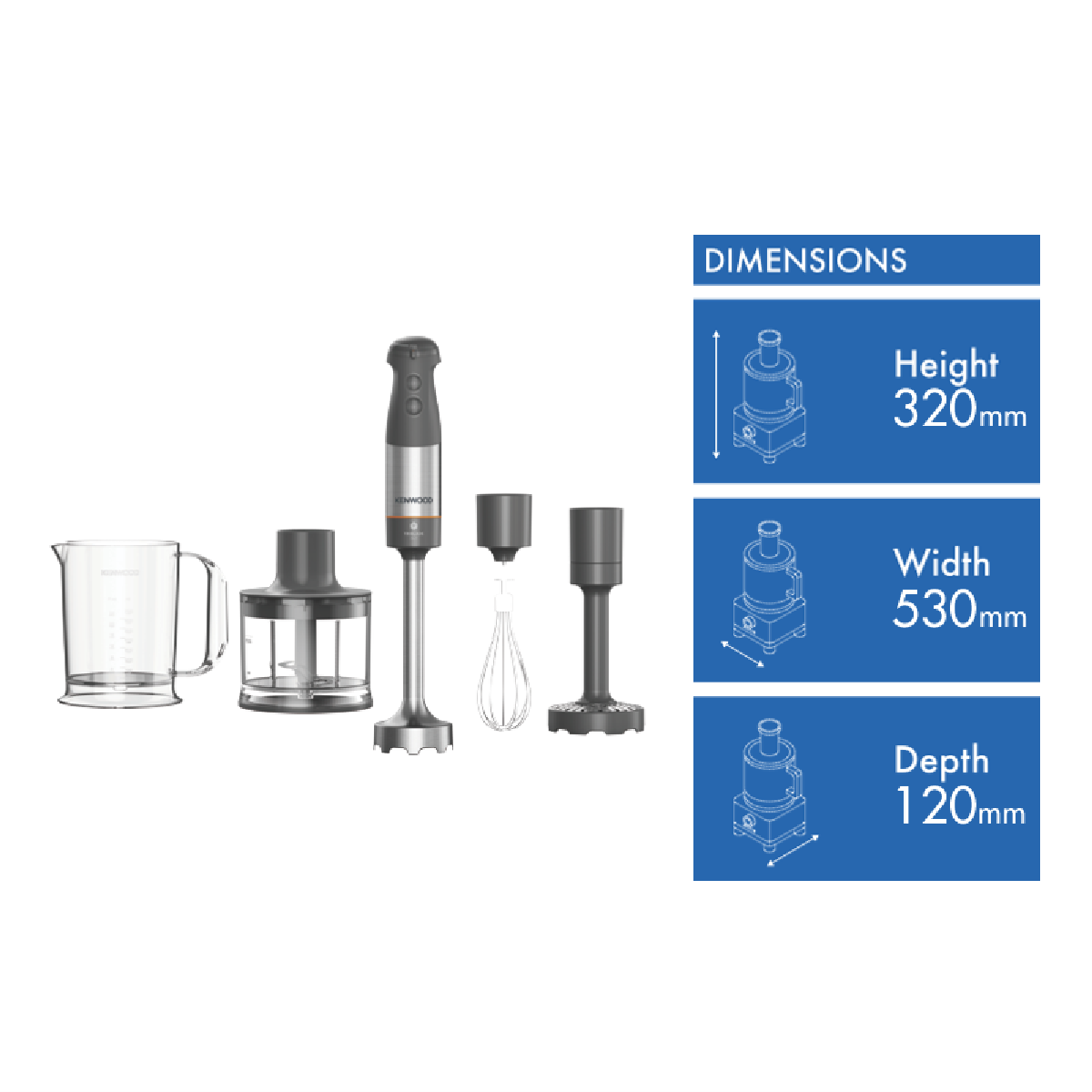 Bring professional-grade power and versatility to your kitchen with the Kenwood Triblade XL Plus Hand Blender. This grey hand blender features a robust 1000W motor and variable speed control allowing you to blend puree and mix ingredients with precision. The durable stainless steel blades effortlessly handle anything from soups to smoothies while the plastic and stainless steel construction provides strength and longevity. With a generous 53cm power cord easy twist attachment fitting and dishwasher safe parts for simple cleaning this hand blender simplifies food prep. The additional accessories including a 0.5L chopper metal whisk and easy pour beaker help you tackle a wide range of recipes. And at 320mm high 530mm wide and 120mm deep while weighing just 1.78kg storage is a breeze. The Kenwood Triblade XL Plus Hand Blender brings power and versatility to your countertop. The manufacturer's part number for this product is HBM60307GY. Discover how this hand blender can streamline meal preparation by getting yours today.
