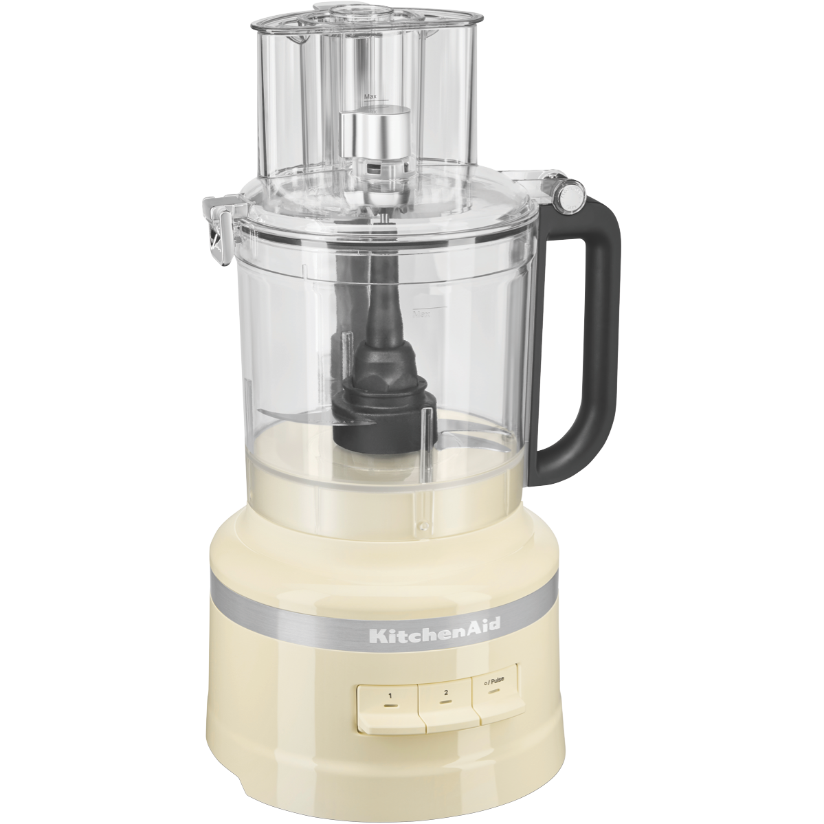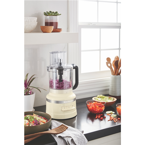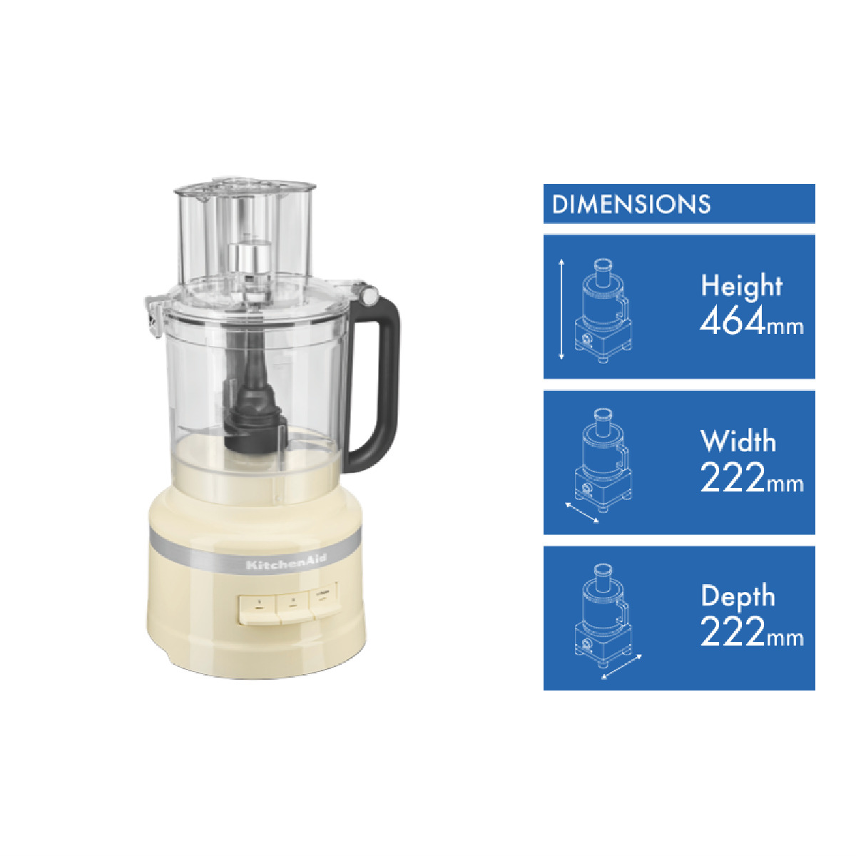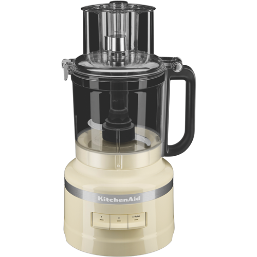Step up your kitchen game with the versatile KitchenAid 13 Cup Food Processor in Almond Cream. This powerful multi-tasker makes food prep a breeze with its 3 speed settings - high low and pulse - easily handling everything from slicing and shredding to kneading dough. The generous 13 cup BPA-free Tritan work bowl accommodates large batches while the dicing kit and adjustable slicing disc provide precision results. With a 400 watt motor sturdy plastic base and dishwasher safe parts for fuss-free cleaning this workhorse processor will be your kitchen's MVP for years to come. Packed with multiple blades and discs including dicing kit dough blade and shredding discs the KitchenAid Food Processor comes ready to tackle any recipe. And the clever all-in-one storage caddy keeps all attachments organized in one spot. At 464mm high 222mm wide and 222mm deep this mid-sized food processor weighs 4.5kg for stability when operating. From quick weeknight meals to weekend batch cooking and entertaining this versatile kitchen multi-tasker will fast become your secret ingredient for effortless homemade cooking. The manufacturer's part number for this product is 5KFP1319AAC. Add this do-it-all food prep assistant to your kitchen lineup now.