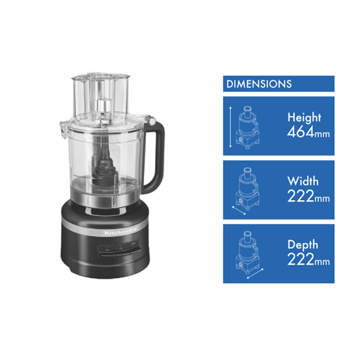 The KitchenAid 13 Cup Food Processor Matte Black 5KFP1319ABM is ready and willing for all the chopping slicing dicing shredding kneading and more a home cook could ever need. This processor has perfect capacity for any meal whether it's a Friday night pizza dough and toppings fresh salsa soup or stock preparation and more. Store all the included accessories cleanly and safely in the included storage caddy. Adjust slicing thickness easily with the ExactSlice lever as required for razor thin or perfectly thick pieces. Get started easily with one click bowl assembly and the latched lid. Keep your dice as uniform and even as possible with this 3.08L capacity KitchenAid Food Processor.
