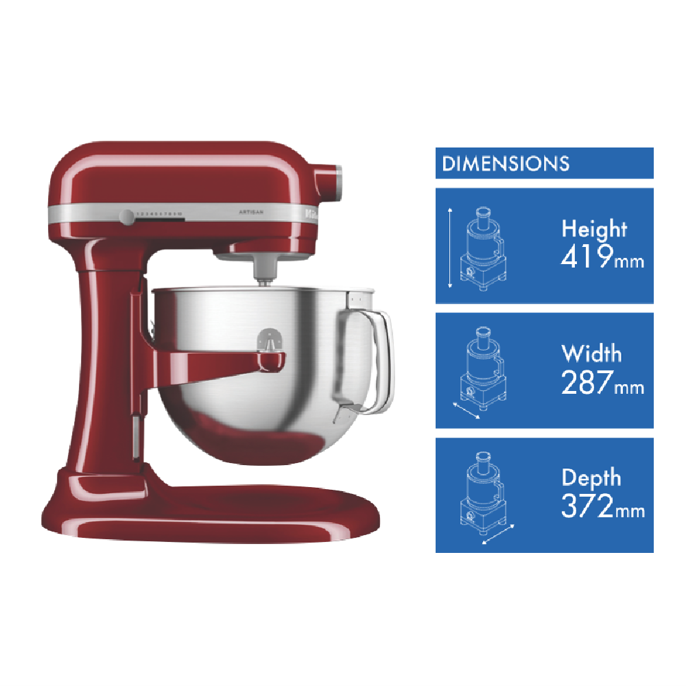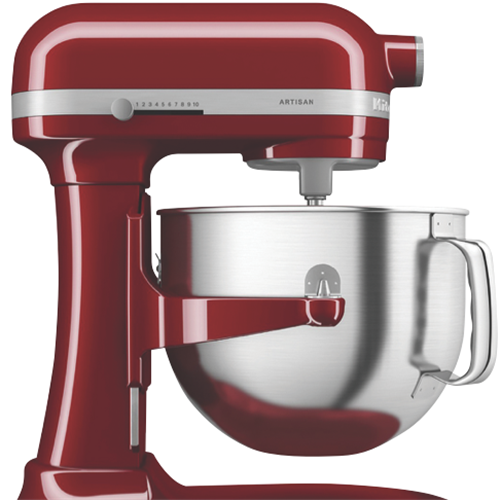 With its iconic Empire Red finish the KitchenAid 6.6L Bowl Lift Stand Mixer brings power and style to your countertop. This heavy-duty mixer features a 375-watt motor and 11 speeds including settings for kneading mixing and shredding making it easy to prepare anything from bread dough to whipped cream. The large 6.6L stainless steel bowl provides ample room for mixing multiple batches or large quantities. For stability when mixing heavy ingredients it has a unique 3-point bowl locking system and stainless steel construction on the bowl and attachments. With a soft start feature for smooth acceleration and the power to thoroughly mix even thick cookie dough or stiff bread dough this mixer will be your kitchen's MVP. The manufacturer's part number for this product is 5KSM70SHXAER. Bring reliable mixing power and timeless style to your kitchen with the KitchenAid 6.6L Bowl Lift Stand Mixer in bold Empire Red.