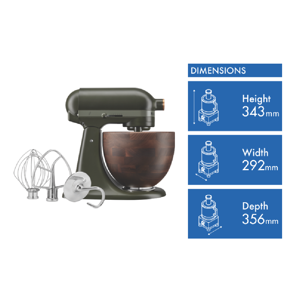 Additional Features One-of-a-kind wood grain bowl design - must be hand washed and dried immediately, regularly season the bowl with food safe wood conditioner, Compatible with over 18 attachments or Stainless Steel bowl (sold seperately), Planetary mixing, Tilt Head
