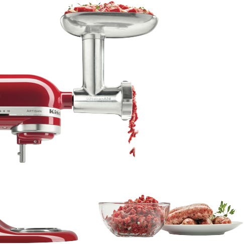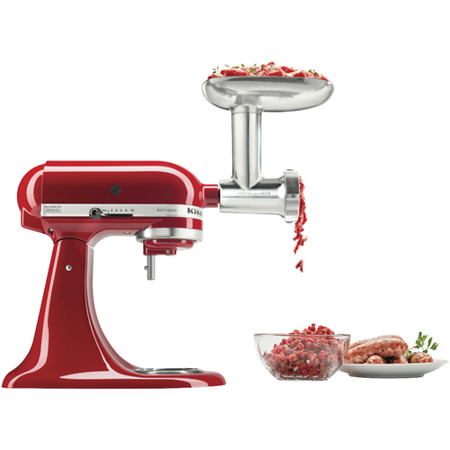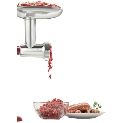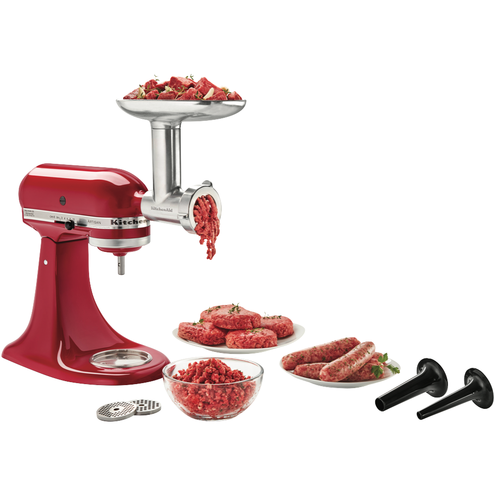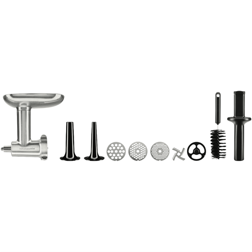 Take your kitchen creations to the next level with the KitchenAid Metal Food Grinder Attachment. This sturdy die cast metal attachment transforms your KitchenAid mixer into a powerful food grinder allowing you to create your own freshly ground meats breadcrumbs and more. With a generous 213mm height and 140mm width you'll have plenty of capacity for grinding large batches of ingredients. Slice grate or mince foods with the included 3 interchangeable grinding plates and sturdy stainless steel blade. The handy food tray sausage stuffer tubes food pusher and cleaning brush ensure seamless grinding and easy cleanup. Bring out your inner chef with this versatile attachment that unlocks exciting new recipes and ingredients. Backed by KitchenAid's 2 year warranty for peace of mind. The manufacturer's part number for this product is 5KSMMGAA. Unlock your full culinary potential with the KitchenAid Metal Food Grinder Attachment today.