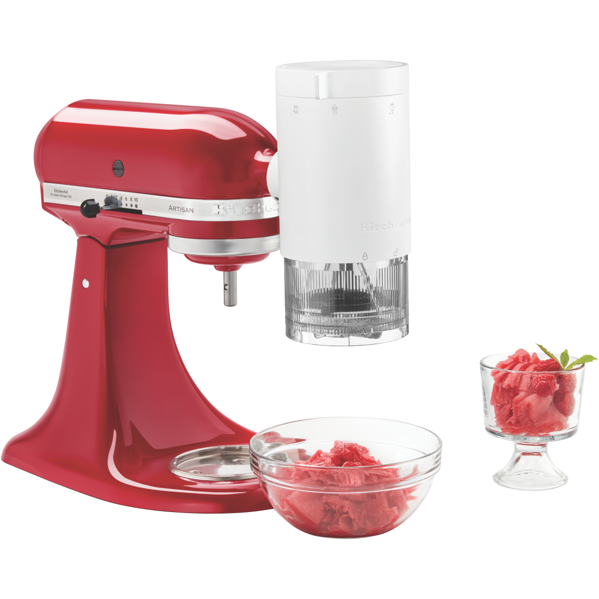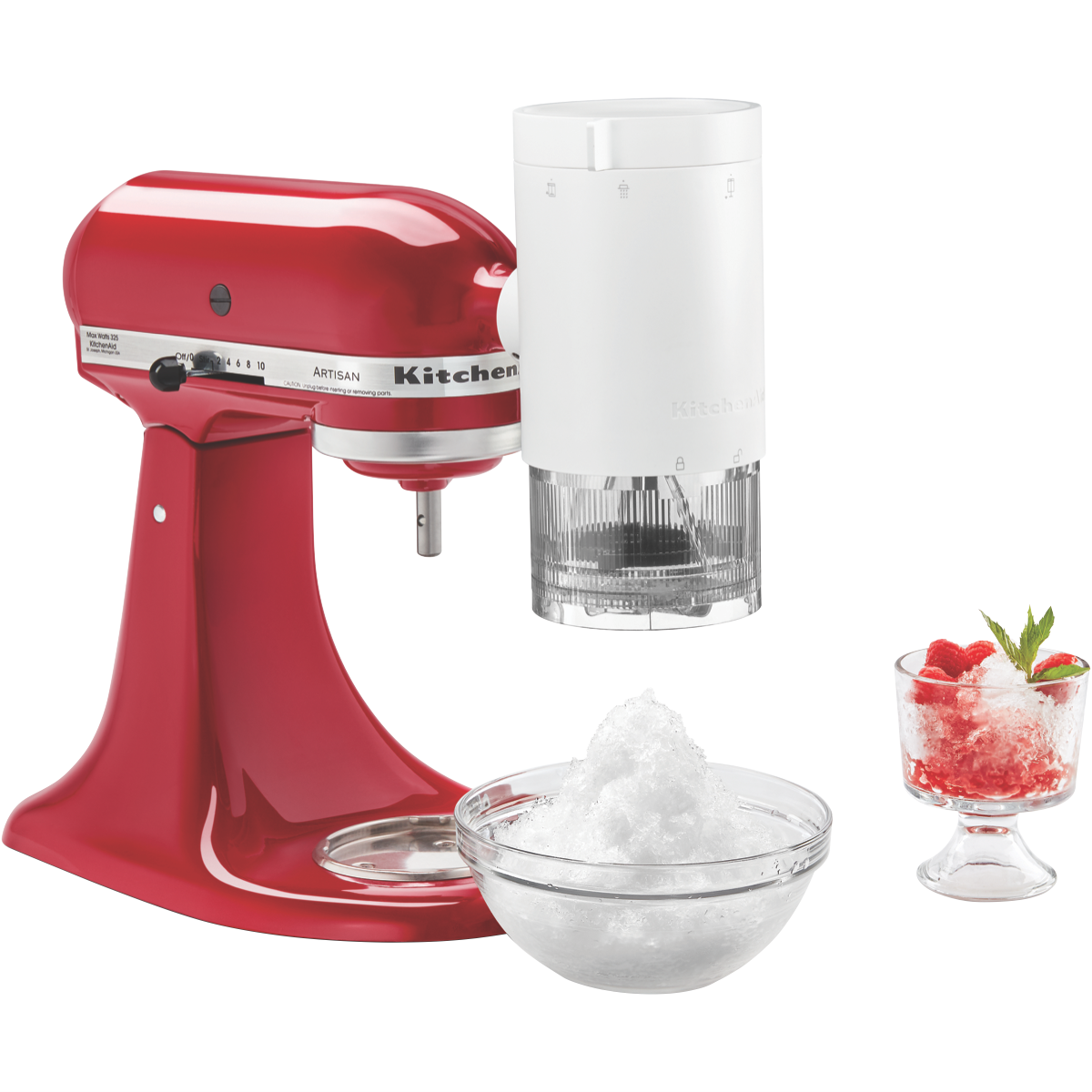 Shaved ice is no ordinary frozen treat. Traditionally made by shaving large blocks of ice its texture is light and fluffy unlike the hard and crunchy snow cone. With the KitchenAid Shave Ice Attachment 5KSMSIA it's so easy to create light fluffy and snow-like shaved ice to elevate a variety of desserts and drinks with your KitchenAid Stand Mixer (sold separately). Make over 500ml of fine shave ice in 60 seconds. Endless options are available like freeze and shave fine or coarse textures water juice coffee and milk or dairy shavings. Surprise and delight by offering a variety of syrups sauces and toppings to make each creation your very own.