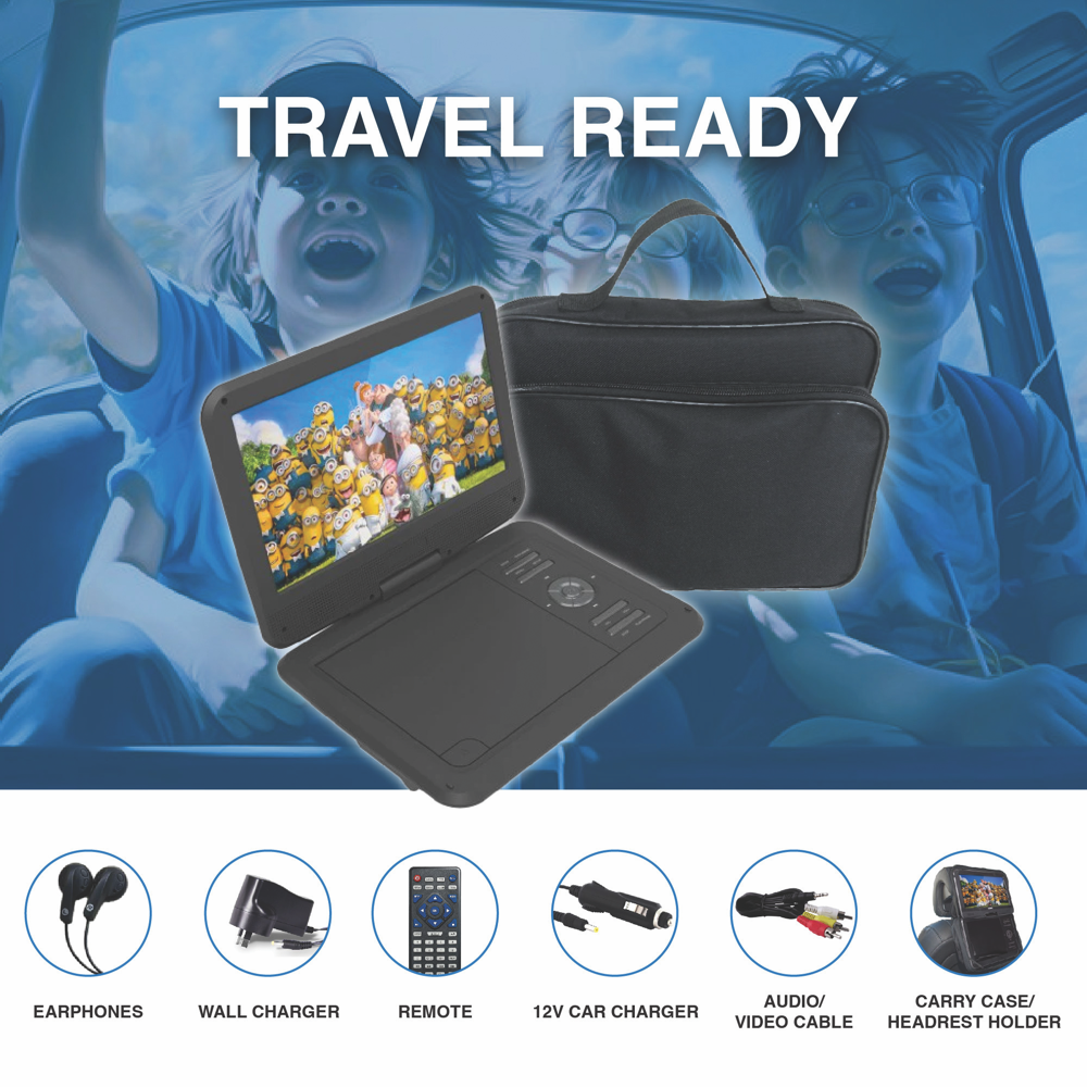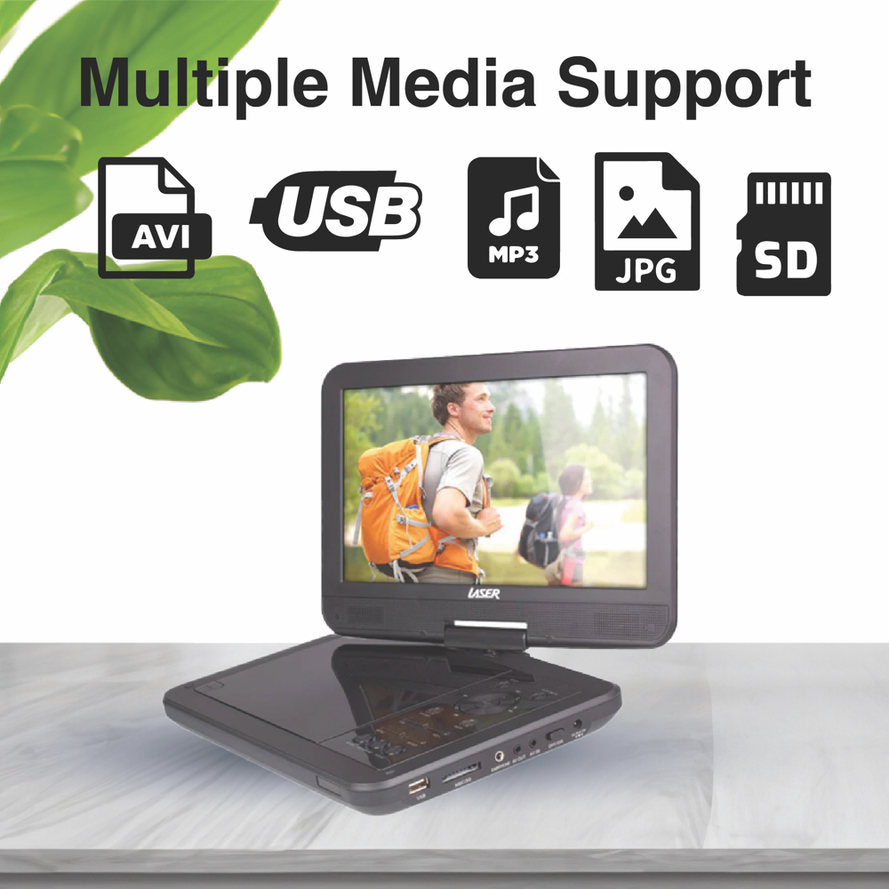 The Laser 10 Portable DVD player is your perfect travel companion offering a high-resolution viewing experience wherever you go. With its large 10 LCD screen that swivels 180° you can share your favorite movies with ease.Whether on a bumpy road or relaxing outdoors the anti-skip technology ensures uninterrupted playback. Compatible with all DVD regions this player allows you to enjoy content from around the world.The built-in rechargeable lithium battery offers extended playtime making it ideal for long trips. Use the 3.5mm headphone jack for private listening or the onboard stereo speakers for shared enjoyment.It also includes a car charger and headrest mount making in-car use convenient and comfortable. Upgrade your travel entertainment with the Laser 10 Portable DVD Player.