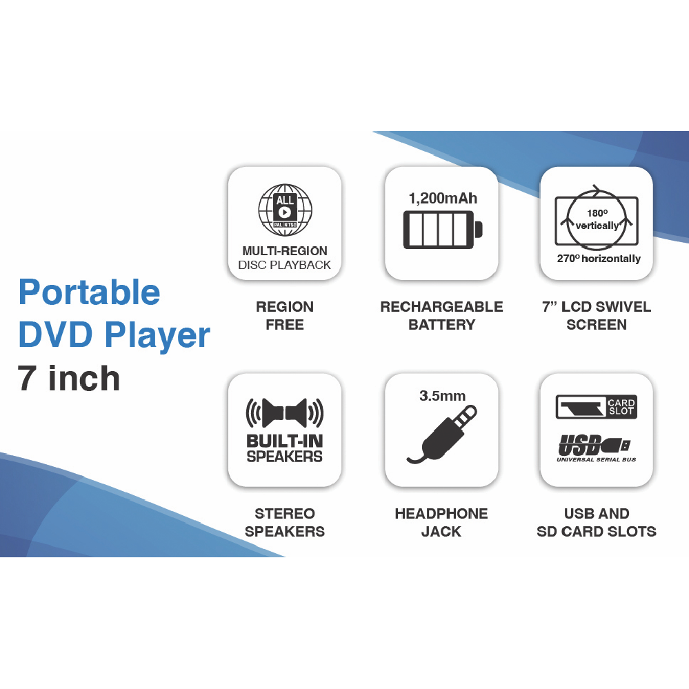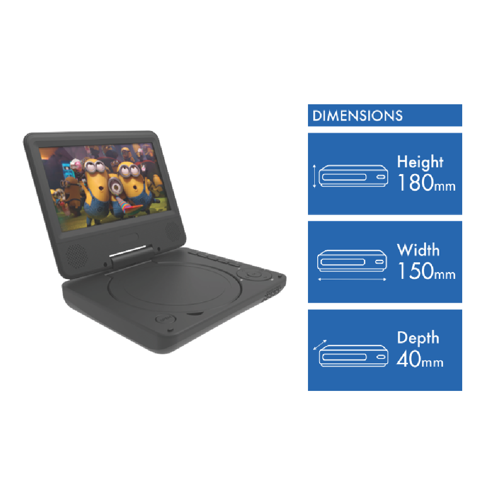 When you need portability and convenience the Laser 7 DVD Player is the ultimate device to deliver your favourite digital content when at home or on the move!The 7-inch-High-res screen offers a great one-to-one viewing experience. The proprietary anti-skip technology buffers playback ensuring your movie plays smoothly even when the journey is bumpy!
