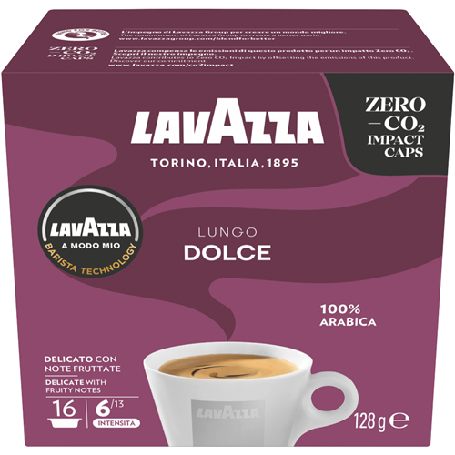 Take it in low and slow with Lavazza Lungo Dolce Coffee Capsules 16pk 88649 compatible with Lavazza's range of Capsule Coffee Machines. This is the goodness of authentic espresso best prepared with milk for the ultimate in smoothness. Sweet soft and creamy note are complemented by dried fruit aromas. This delicate Intensity 6 100% arabica coffee is a surefire hit at home and away. Enjoy your cup guilt free with these capsules having their environmental impact offset by Lavazza making them Carbon Neutral.