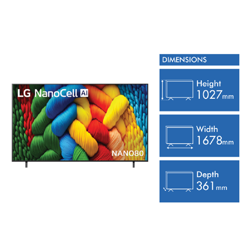 Get ready for a TV that brings the cinema to your living room. This LG 75 NANO80A Smart TV delivers stunning 4K Ultra HD resolution with NanoCell Colour technology for vibrant lifelike images. The a7 AI Processor 4K Gen8 upscales content and adjusts picture and sound for an immersive viewing experience. With WEBOS 25 you can easily access your favourite streaming apps like Netflix Disney+ and Stan. The TV supports HDR10 and HLG formats for enhanced contrast and brightness. Use voice commands with ThinQ or Microsoft Copilot to control your TV hands-free. Game enthusiasts will appreciate the < 12ms response time and G-Sync/FreeSync compatibility for smooth gameplay. This energy-efficient TV has a 5-star rating using 605 kWh/year. Mount it on the wall with a 400 x 400 VESA mount or use the included stand. The LG 75NANO80ASA comes with a 1-year manufacturer's warranty for peace of mind.