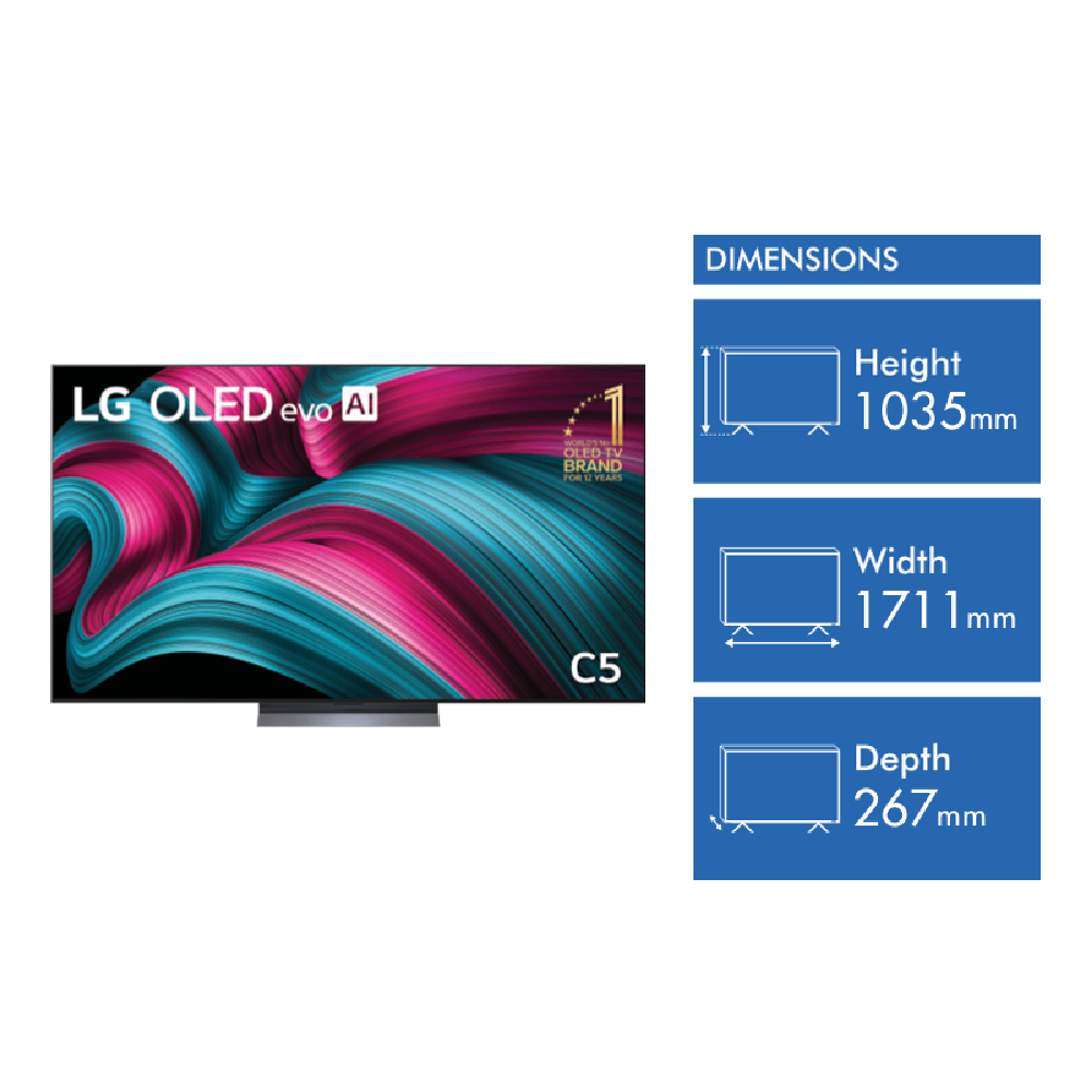 Experience cinema-quality visuals at home with this LG 77 OLED EVO C5 TV. The massive 77-inch screen with 4K Ultra HD resolution (3840 x 2160) brings movies and shows to life with stunning clarity and vibrant colours. Powered by the a9 AI Processor 4K Gen8 it delivers smooth motion and upscales content beautifully. Gamers will love the 120Hz refresh rate and 1ms response time for lag-free play. The TV supports Dolby Vision and Dolby Atmos for immersive audio-visual experiences. Smart features include WEBOS 25 and voice control via ThinQ or Microsoft Copilot. With a 5-star energy rating it's efficient too. Mount it on the wall or use the included stand - either way this OLED evo TV will be the centrepiece of your living room. The LG OLED77C5PSA comes with a 1-year manufacturer's warranty for peace of mind.