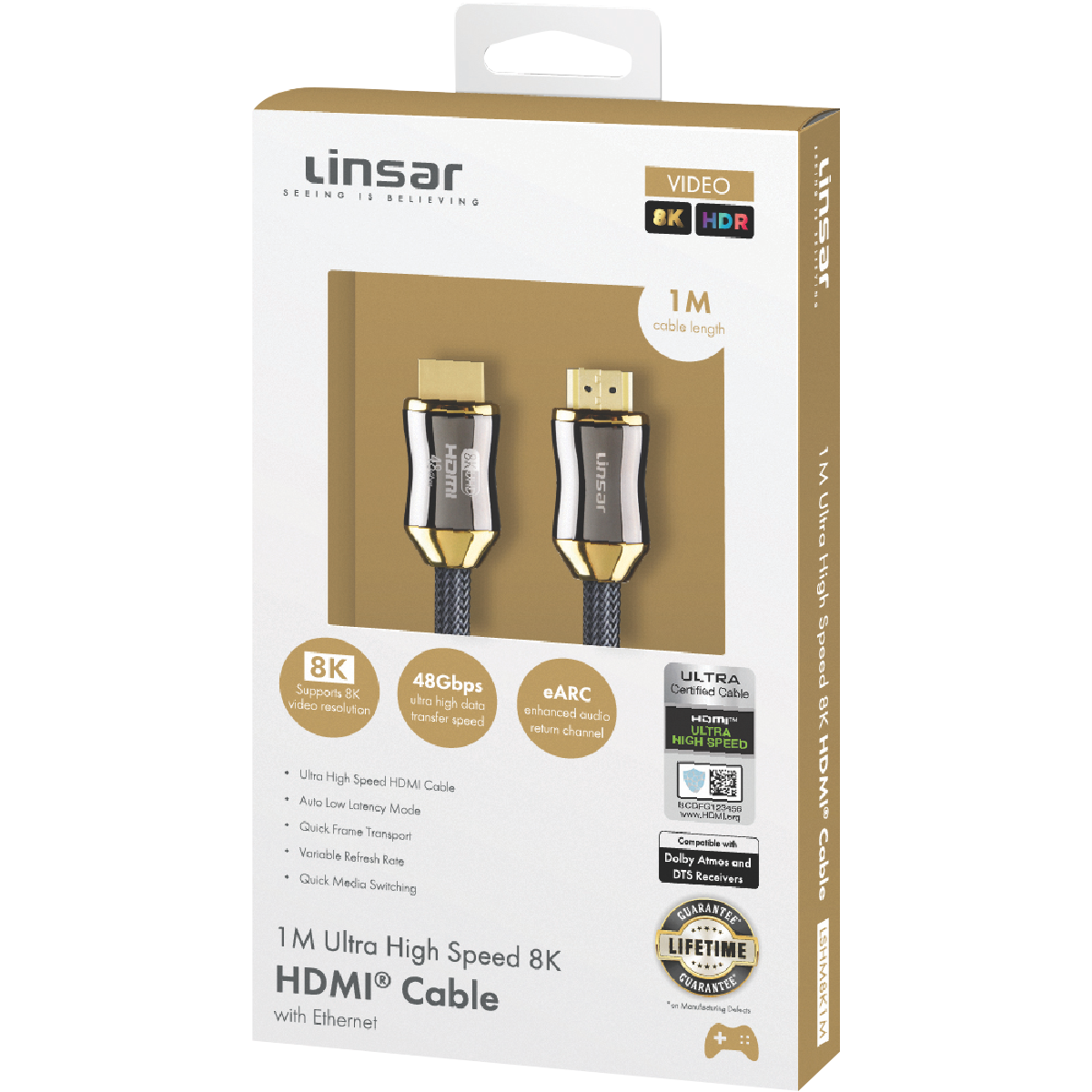 Step into the future of high definition connectivity with the Linsar 8K High Speed HDMI Cable. This 1 meter cable is designed for the highest video and audio quality supporting stunning 8K resolution and blistering 48Gbps transfer speeds. The advanced HDMI Ultra High Speed design ensures full compatibility with your cutting edge 8K TV or monitor delivering the bandwidth needed for smooth 8K 60Hz video with HDR. Constructed using high purity copper conductors and corrosion resistant gold-plated connectors this premium cable provides a flawless link between your 8K source and display. Experience the visual impact of over 33 million pixels in breathtaking clarity with no dropped frames or picture degradation. The LSHM8K1M is perfect for all your 8K applications from gaming to movies and beyond. With future-proof performance you can rely on upgrade to the Linsar 8K HDMI cable today. The manufacturer's part number for this product is LSHM8K1M.
