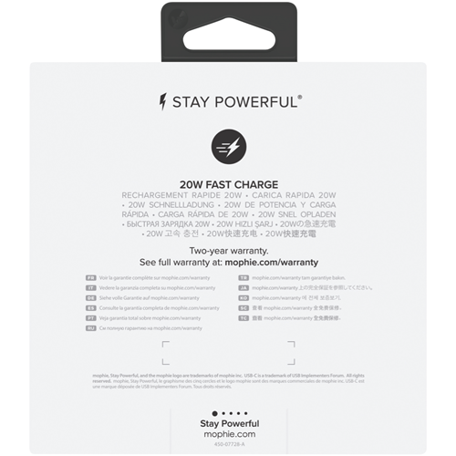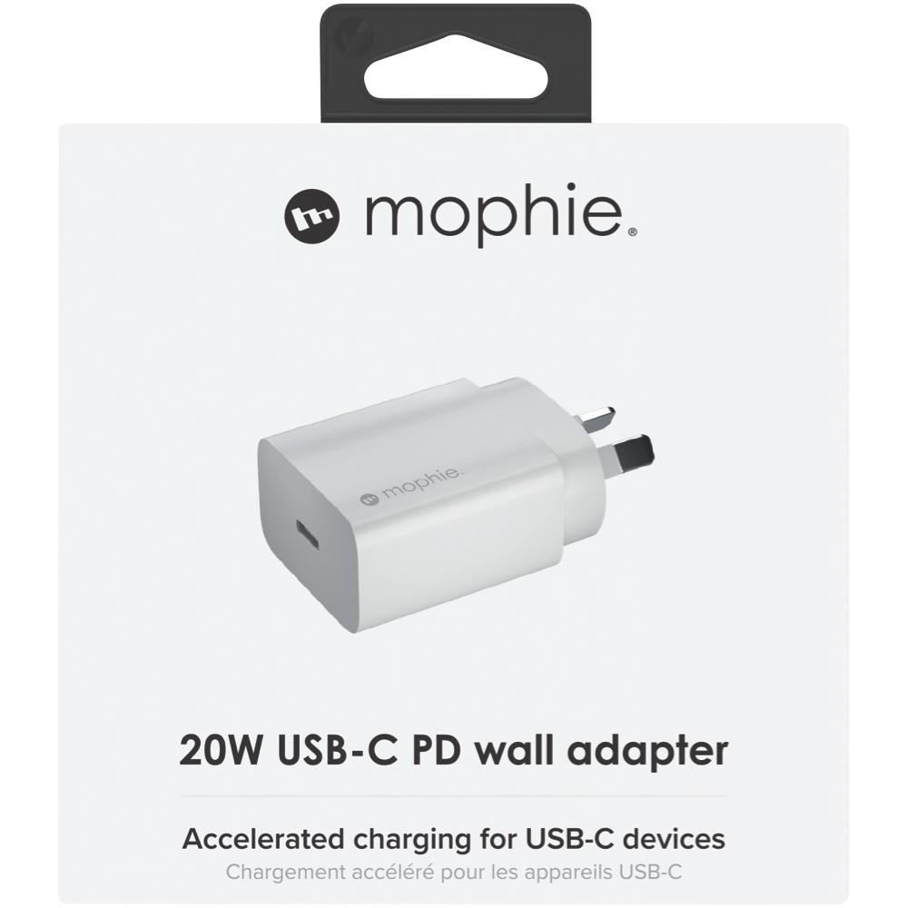 Energize your devices with the Mophie 20W Wall Charger USB-C PD. This premium charger delivers up to 20W of power through its USB-C port providing the fastest possible charge to your USB-C devices. Crafted with anodized aluminum in a compact design it adds sophisticated style anywhere you need power. Just plug it into any wall outlet and connect your phone tablet or laptop to begin rapid charging. The integrated USB-C Power Delivery port provides the exact power your device needs for safe optimized charging. Whether you're charging at home the office or on the go this wall charger's premium finish and performance provide reliable power in a portable package. Rest assured too - the 24 month warranty provides peace of mind with this Mophie charger. For stylish accelerated charging choose the Mophie 20W Wall Charger USB-C PD.