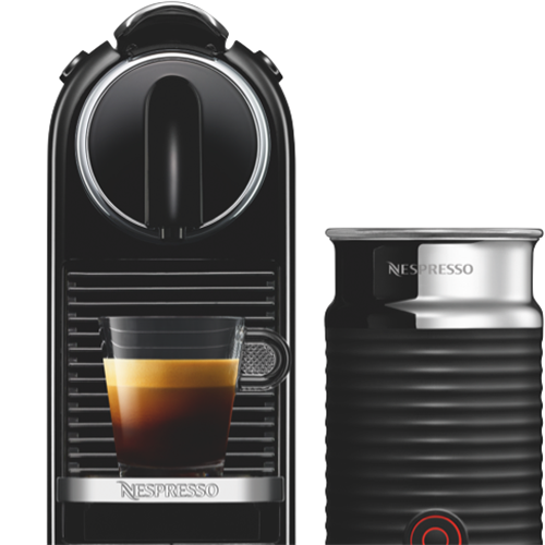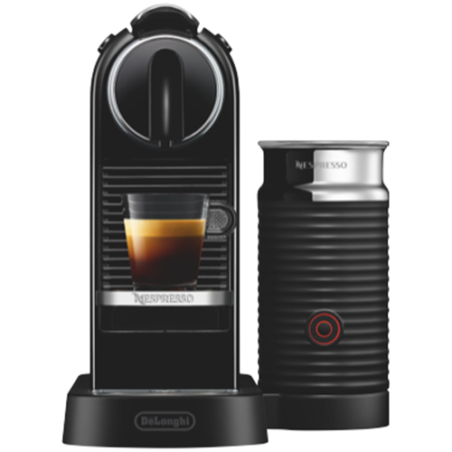 Enjoy a smooth espresso in less than a minute with this Nespresso DeLonghi Citiz & Milk Capsule Machine in sleek black EN267BAE. The capsule machine heats up in less than 25 seconds so your next caffeine hit is never far away. All you need to do is pop in your Nespresso capsule close the lever and select either an espresso or lungo with just the touch of a button. Your coffee shot will always be the perfect length thanks to the Delonghi coffee machine's programmable flow stop function to make that first morning brew as simple as can be. Achieve a golden crema and stop splashes with the two-height sliding cup position tray so your cup is always at the perfect height. Easily create milky coffees including lattes with the Aeroccino milk frother - attach the whisk fill the Aeroccino with milk and at a touch of the button the Aeroccino will heat and froth your milk to perfection ready for you to top up your coffee. If a flat white is your usual order use the milk mixer to heat your milk without froth and foam. You can even create cold frothed milk for iced coffees and other chilly caffeinated concoctions. Create deliciously smooth espressos lattes and more in seconds with this Nespresso DeLonghi Citiz & Milk Capsule Machine.