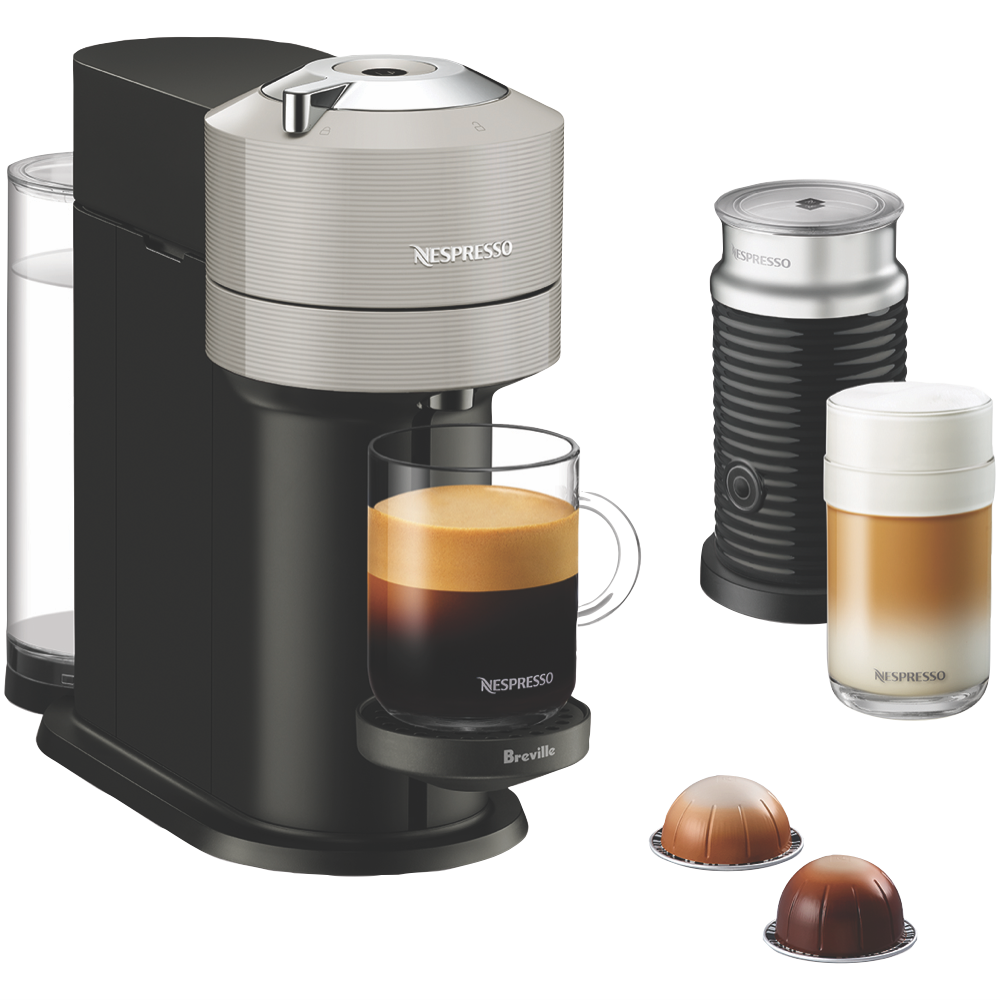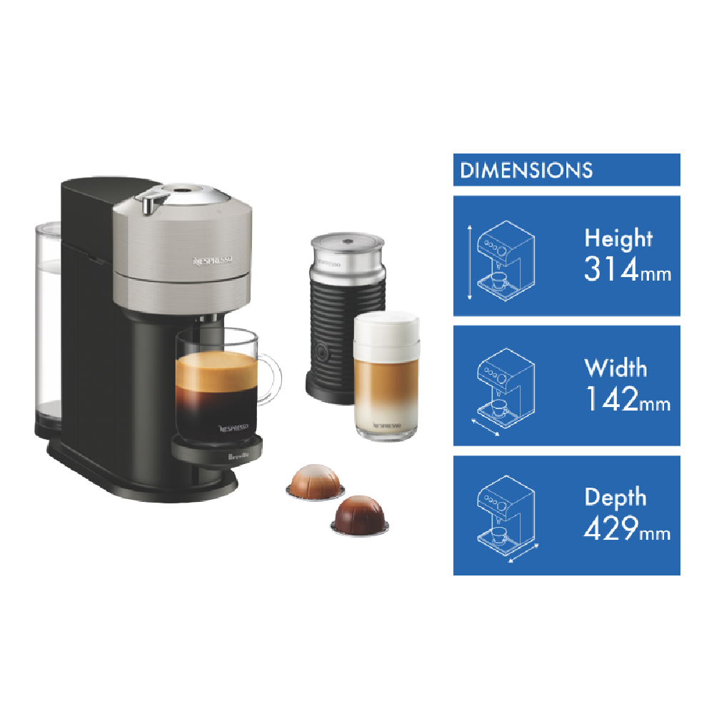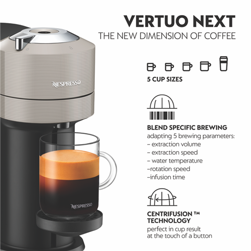 Make barista-quality coffee at home with the Vertuo Next Capsule Coffee Machine in Light Grey. This sleek machine uses CENTRIFUSION technology to brew five different cup sizes from espresso to alto so you'll always get the perfect amount for your mood. With a quick 30-second heat-up time and generous 1.1L capacity you won't be kept waiting for your morning caffeine fix. The included Aeroccino milk frother lets you create creamy cappuccinos and lattes with ease while the auto-shut off feature saves energy when you're done. Comes with a tasting box of Nespresso capsules and 2-year warranty. Model BNV550GRY4JAN1.